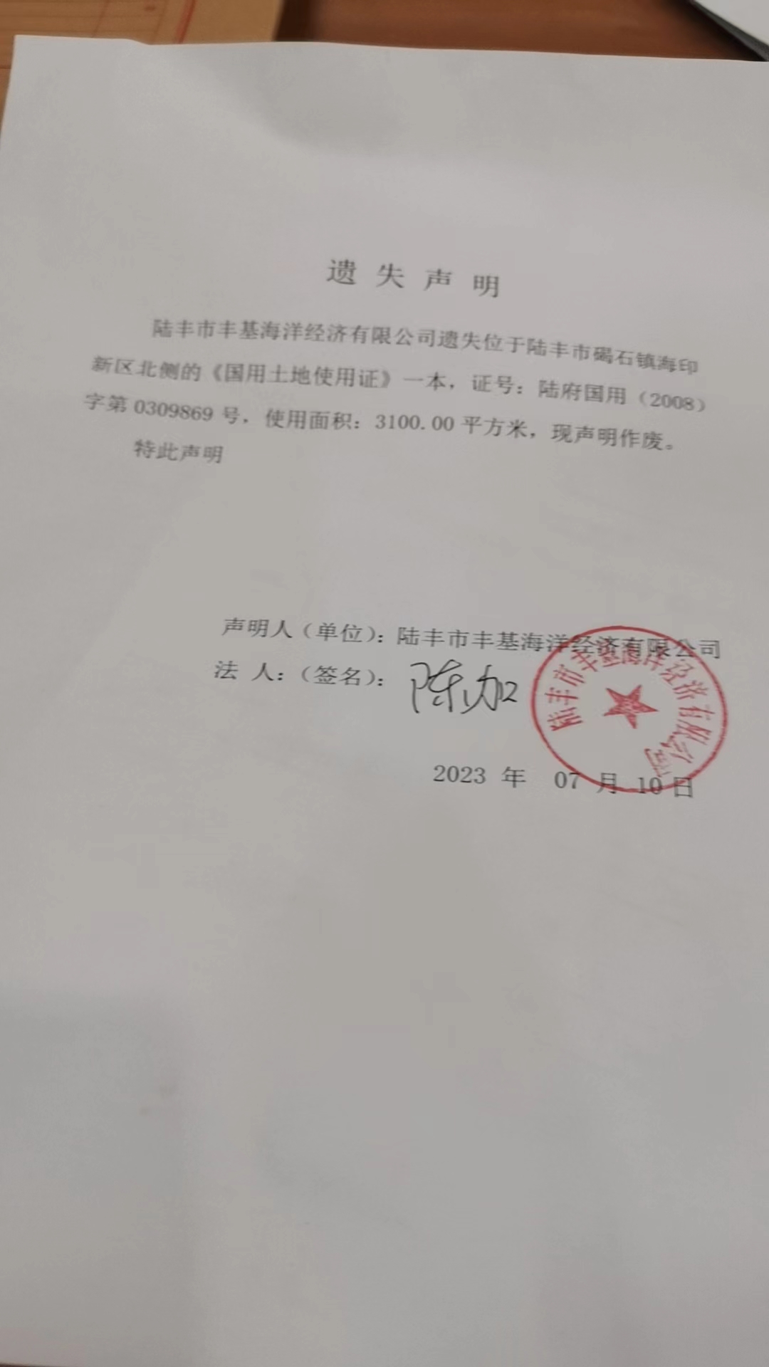 苹果直播 丰基海洋经济有限公司遗失位于苹果直播 碣石镇海印新区北侧的《国用土地使用证》一本,证号:陆府国用(2008)第0309869号,使用面积:3100.00平方米。现声明作废。