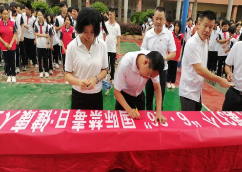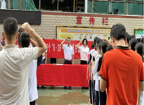与此同时,伴随城东中学操场上冉冉升起的五星红旗,分会场活动正式开启。街道办党工委副书记文志慧和常务副主任曾晓霞出席分会场活动,文志慧副书记发表了动员讲话。随后带领全体师生进行禁毒宣誓,并开展全体师生“健康人生,绿色无毒”签字及参观禁毒教育基地活动。