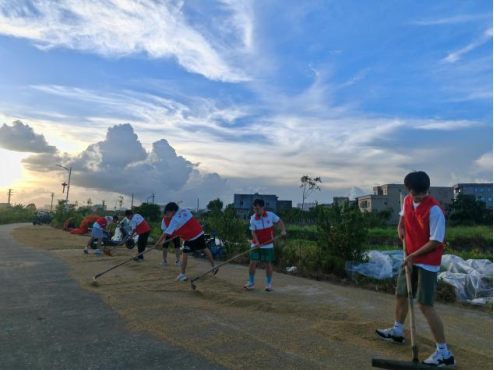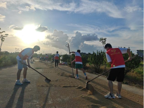 活动结束,大学生志愿者一行人来到田野边帮助村民晾晒稻谷,志愿者们在村民们的指导下翻、推、扫、堆……积极参与到农作活动中来,感受丰收的喜悦。