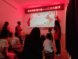 此次主题活动共有三个环节。首先是志愿者们为学生们带来精彩的演讲小课堂。他们通过简单的口部操、开声、气息练习、普通话四声歌、简单的绕口令开展演讲口才授课。