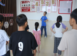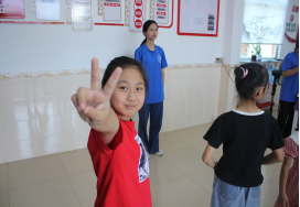 “1234、2234,握紧你的小拳头,跟我一起动起来…”志愿者一个八拍一个八拍地进行舞蹈教学。安静的小学生学跳舞的时候动作也能放得开,在十五分钟内都学会了《噜啦啦快乐舞》。