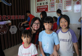 学生们在志愿者的带领下找准节奏感,辨别出平翘舌、前后鼻音,志愿者们细心地发现学生们普通话的缺陷并给予纠正,帮助小朋友们更熟练地使用普通话,提升口才能力。