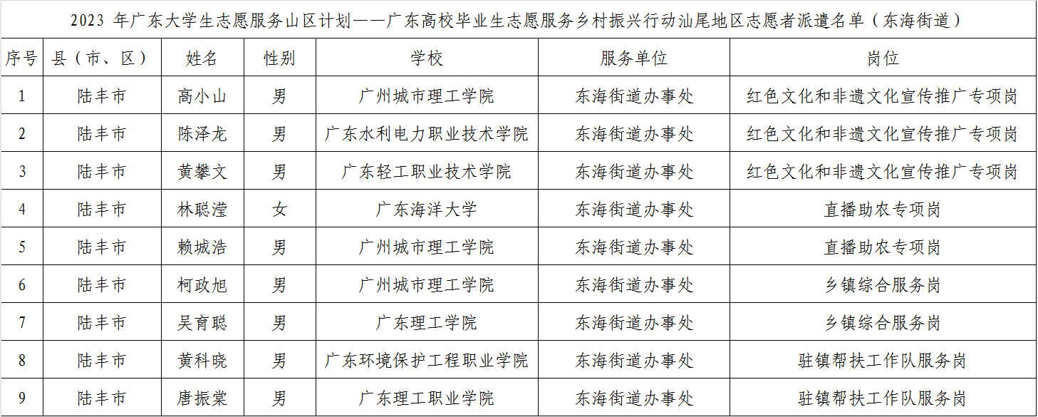 2023 年广东大学生志愿服务山区计划——广东高校毕业生志愿服务乡村振兴行动汕尾地区志愿者派遣名单(东海街道)