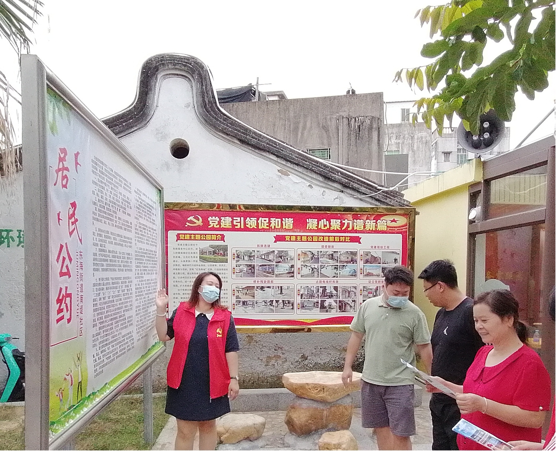 在东海街道南堤社区党群服务站前醒目位置矗立着一块小公示牌,上面记载着南堤社区干群共同达成的“十九条居民公约”:听党话,感党恩,跟党走;遵纪守法,遵守公德;邻里和睦、和谐融洽;提倡婚事新办;推行绿色文明殡葬;遵守交通法规;搞好公共卫生,不乱丢垃圾;落实常态化疫情防控各项规定;压实涉疫个人责任;党员、干部等要在疫情防控中示范带头.........