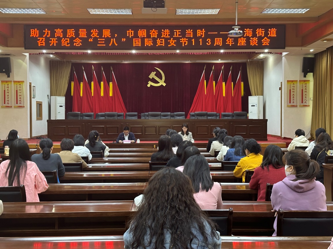 3月8日,“助力高质量发展 巾帼奋斗正当时”东海街道召开纪念“三八”国际妇女节113周年座谈会在会议室召开。街道党工委副书记胡炳楚同志出席会议,街道女职工干部和各村(社区)妇联主席约60人参加会议。