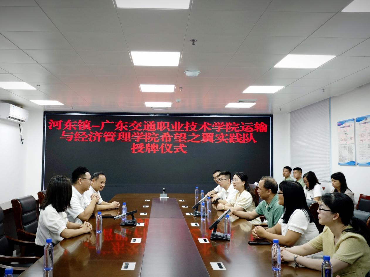 2024年6月29日下午,广东交通职业技术学院运输与经济管理学院希望之翼实践队暑期“三下乡”社会实践授牌仪式在苹果直播 河东镇人民政府顺利进行。河东镇党委副书记、镇长邱汉专、党委副书记余梓乔、团委书记廖静,运输与经济管理学院党委书记伍雄晖、副院长蔡善文、办公室主任吴双芳、辅导员曾生峰和实践队成员出席参加。