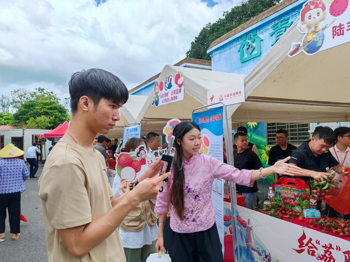 广东交通职业技术学院海陆弘文实践队应邀参与开幕中的荔枝网络直播带货与推广的环节。直播间设于河东镇青山村文化集市广场。活动现场,“红丽人”“双蒂红无核荔枝”“迟美人”“凤山红灯笼”等品牌的荔枝纷纷亮相。实践队充分发挥新媒体技术优势,通过微信视频号和抖音等平台同步推送,收获点赞量逾2万次,有效提升了陆丰荔枝品牌,拓宽了荔枝的销路。