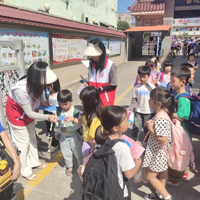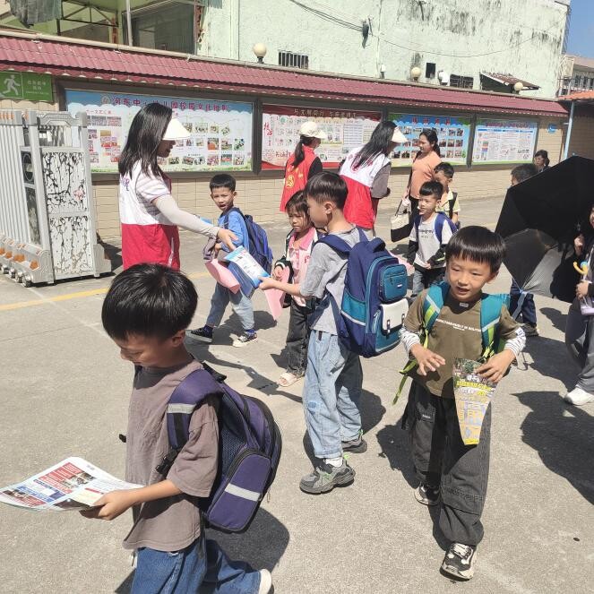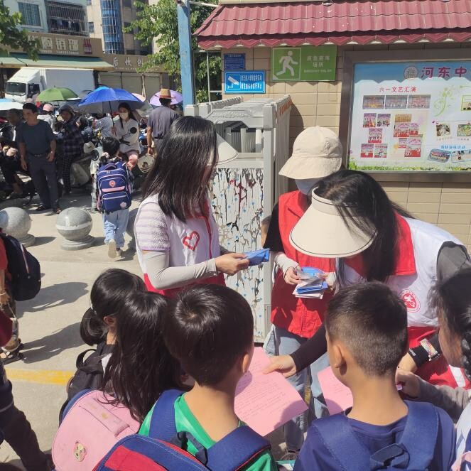 时值河东镇中心小学放学时间,志愿者们来到小学门口,向家长、学生派发交通安全知识宣传单,叮嘱学生们要注意交通安全,同时鼓励学生们争当小小宣传员,回家向家长普及交通安全知识,并监督家长骑摩托车出门要戴好安全头盔,让安全文明出行伴随每一个人。