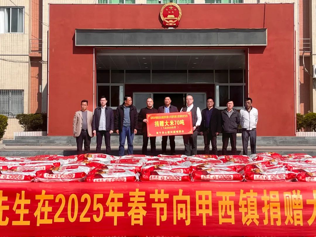 在2025年春节来临之际,香港恒裕集团董事局主席龚俊龙先生再次为甲西镇困难群众捐赠70吨大米,给困难群众送去爱心和温暖,帮助困难群众解决实际问题,为助力甲西高质量发展贡献乡贤力量。