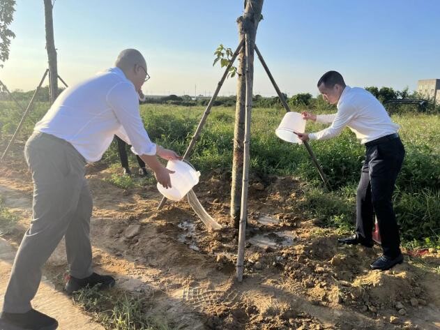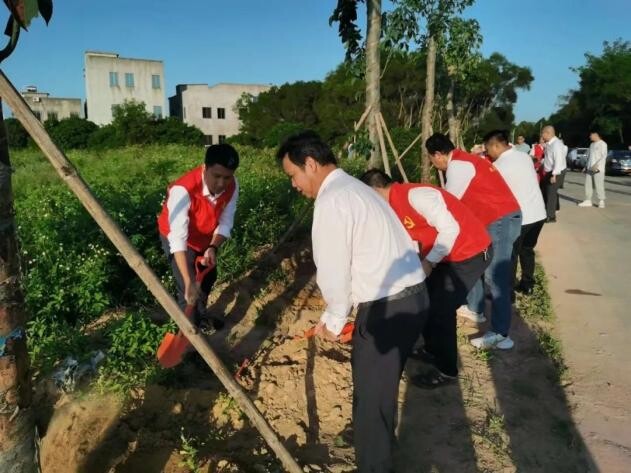 活动开始,镇党政主要领导率先落铲,带领着大家培土、筑盘、浇水、种苗,每一道工序都认真细致。大家分工明确,配合默契,忙中有序。在大家的努力下,一棵棵树苗立于风中,生机勃勃,为乡村再添一道绿色的风景线。