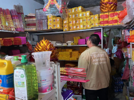 今日排查行动共出动约20人次,检查商户30间,暂无发现违规售卖、存储烟花爆竹行为。