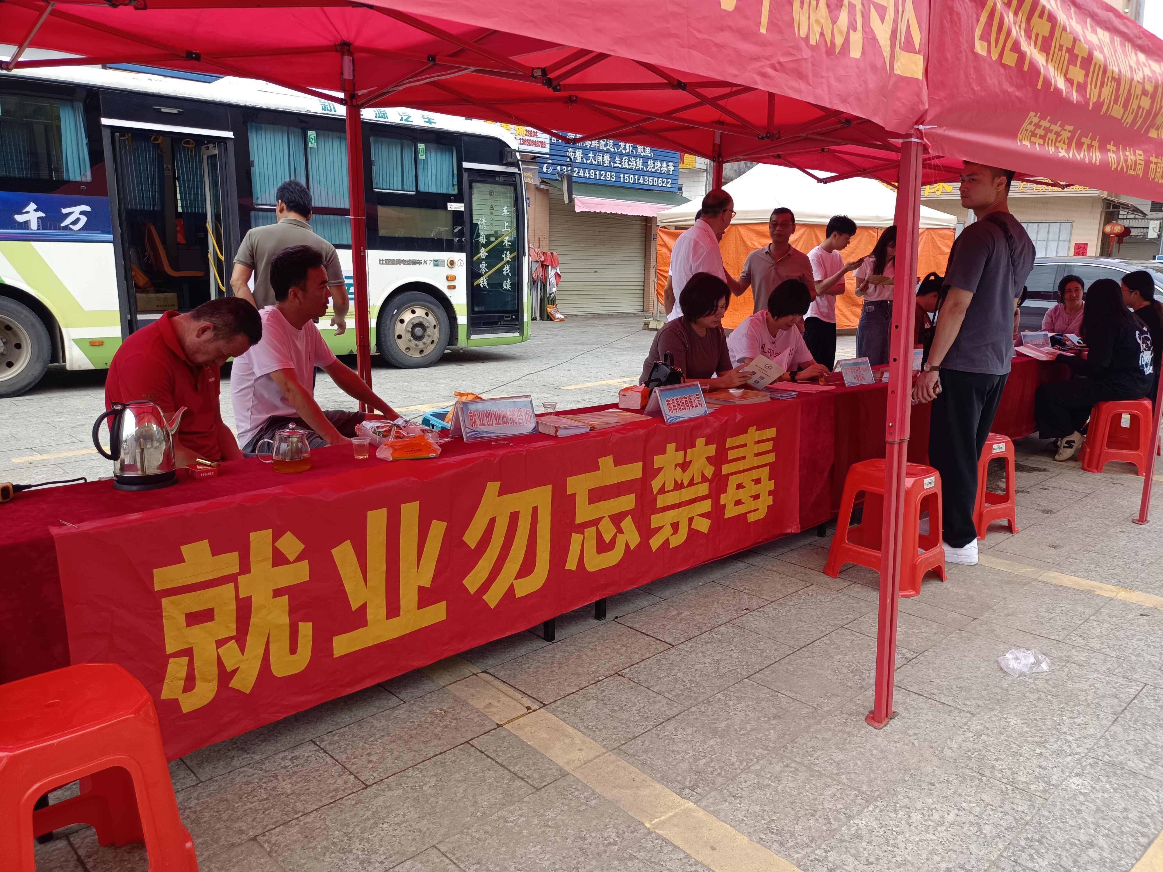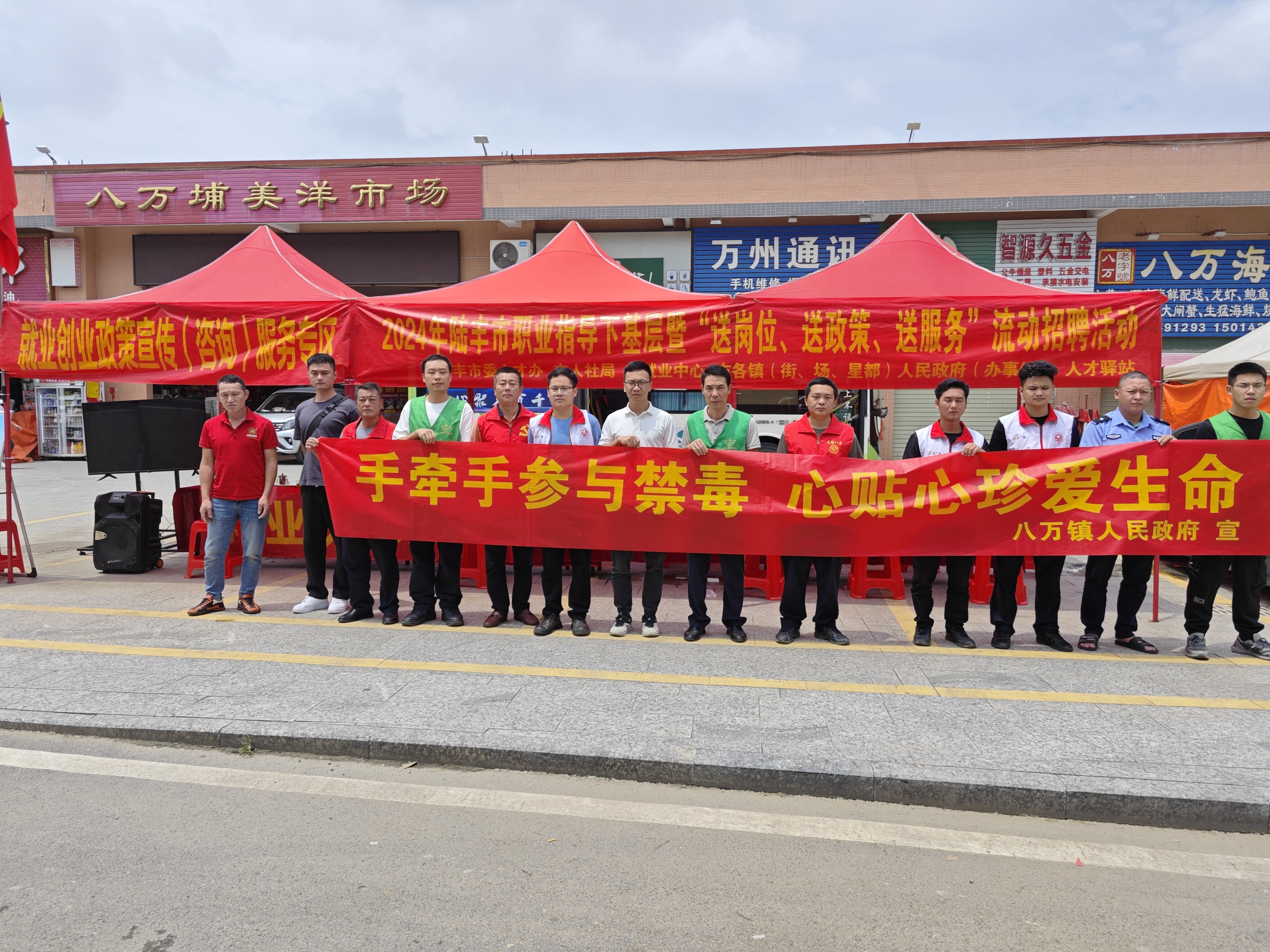 为进一步增强全民禁毒意识,向求职务工人员普及禁毒知识,整体推进群众禁毒宣传教育全覆盖,2024年5月8日,以汕尾(陆丰)市职业指导下基层招聘活动为契机,联合市人才办、人社局和就业中心,我镇组织禁毒办、团镇委、公共服务办,八万村(社区)两委干部、志愿者、网格员共30余人,在八万村埔美洋广场开展禁毒宣传及戒康人员就业帮扶活动。