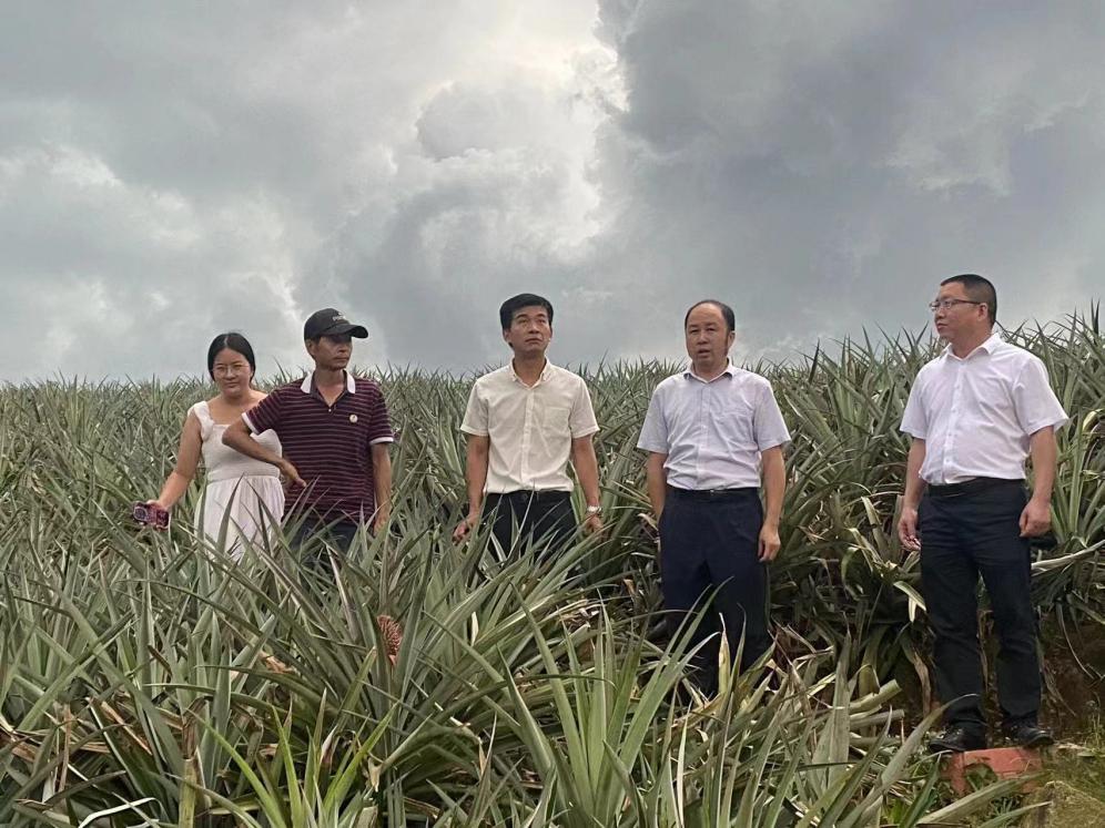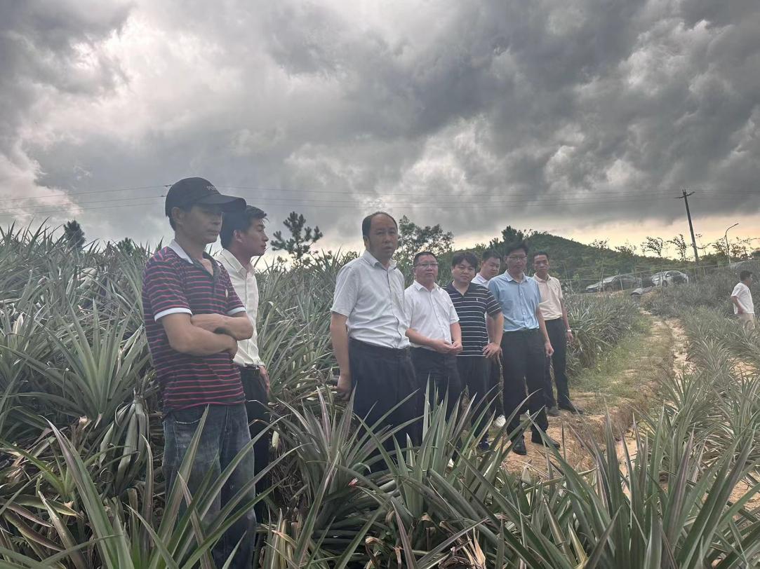 7月24日,省农科院刘传和研究员、市农业中⼼魏伟全主任和张少润副主任一行到我镇开展新品种“粤甜”菠萝种植调研,实地考察种植基地选址,洽谈合作事宜。