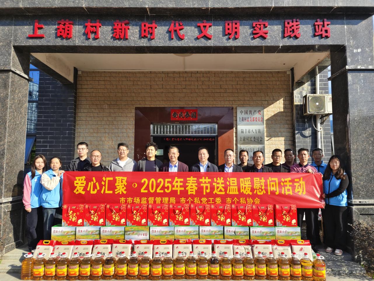 1月15日,在新春佳节即将来临之际,汕尾市市场监督管理局副局长陈文戟带领市个私党工委、市个私协会到八万镇开展“爱心汇聚·2025年春节送温暖”慰问活动,走访慰问了困难群众,为其送上大米、食用油、礼盒等慰问品,并向他们送去新春的祝福。八万镇庄小民镇长陪同走访慰问。