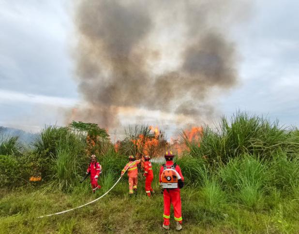 救援队伍快速到达火情发生所在位置,根据现场研判,起火位置植被旺盛,火势蔓延迅速,距离配电设施约300米,火点旁有一处河流可取水。决定使用2部灭火水泵以水灭火快速控制火势,辅助使用风力灭火机缩小火势蔓延范围。经过紧张有序的扑救,明火已被彻底扑灭,明火扑灭后,现场人员对火场进行了全面细致的检查清理,防止火场复燃。
