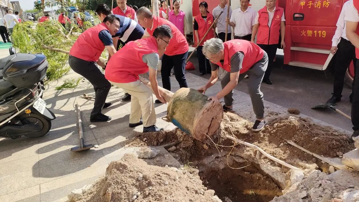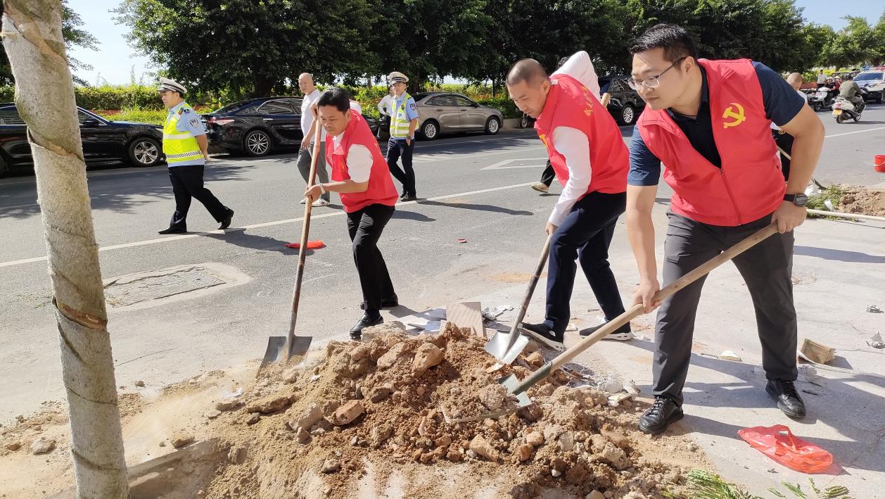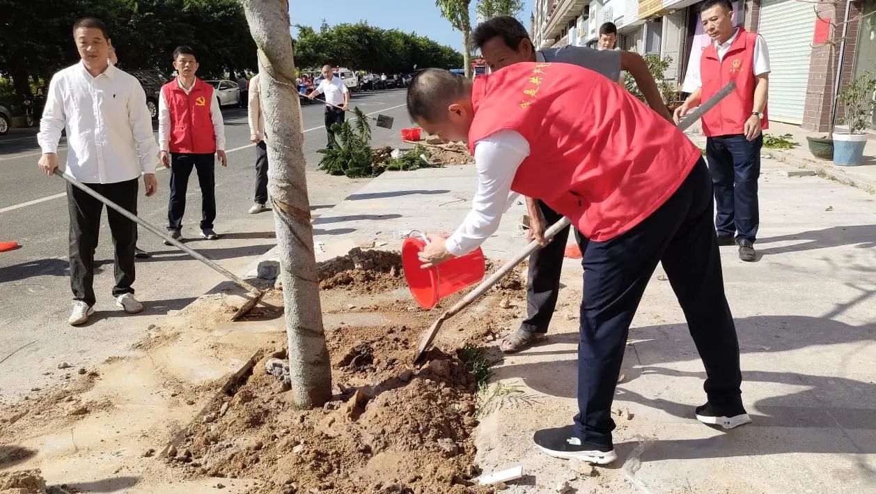活动现场,或三人一组,或五人一队,徐鸿亮同志带领众人挥锹铲土、扶苗培土、夯实土层。挖坑、扶苗、压土、浇水,各环节衔接有序,配合默契,现场一片繁忙有序、干劲十足的景象。历经2个小时的辛勤劳作,一株株香樟树、凤凰树、铁刀木树苗错落有致,迎风挺立,焕发出无限生机与活力。