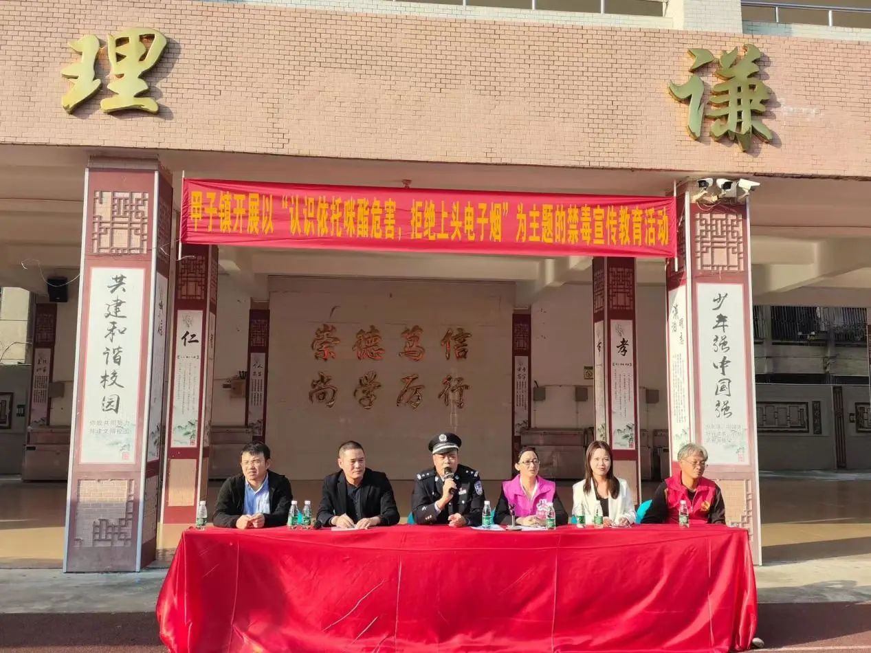 为贯彻落实汕尾市委、苹果直播 委两级禁毒专题会议精神与“1018”专项行动总体要求,进一步营造浓厚的校园禁毒教育氛围,在青少年群体中 宣传新型毒品滥用危害,防止新精神活性物质流入校园,12月5日,甲子镇在甲子镇第二中学开展以“认识依托咪酯 拒绝上头电子烟”为主题的禁毒宣传教育活动,活动由甲子镇第二中学校长主持。
