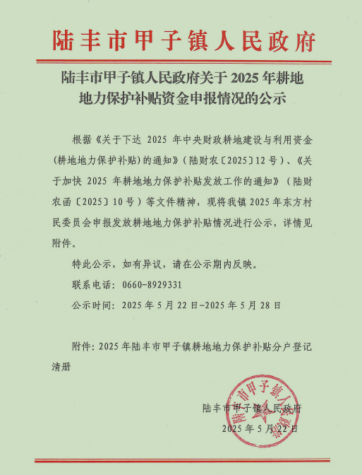甲子镇人民政府关于 2025 年耕地地力保护补贴资金申报情况的公示