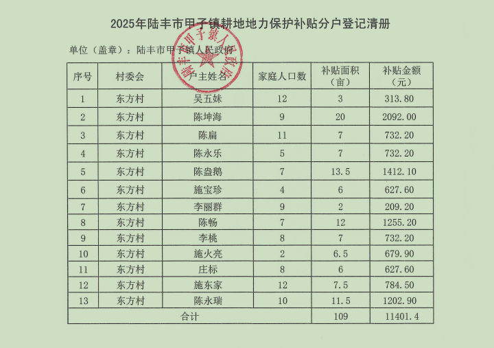根据《关于下达2025年中央财政耕地建设与利用资金(耕地地力保护补贴)的通知》(陆财农[2025]12号)、《关于加快 2025年耕地地力保护补贴发放工作的通知》(陆财农函[2025]10号)等文件精神,现将我镇2025年东方村民委员会申报发放耕地地力保护补贴情况进行公示,详情见下图。