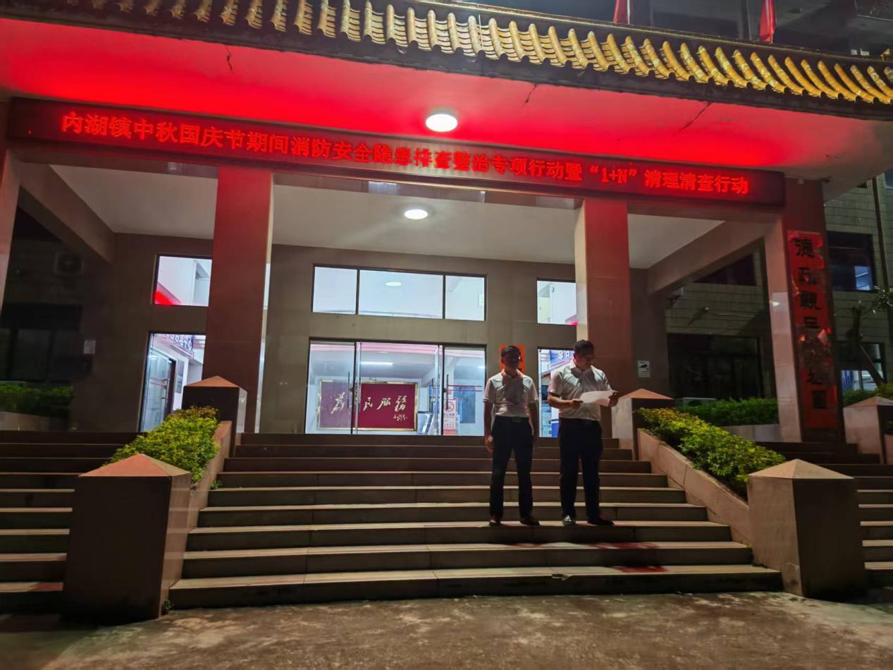 为贯彻落实习近平总书记关于安全生产的重要指示精神,牢固树立“人民至上、生命至上”理念,做好“国庆”“中秋”双节期间社会面治安稳定和消防安全工作,方能营造平安稳定的社会环境。“双节”期间,各类活动增多,用火用电频繁,火灾风险加剧。为保障群众生命财产安全,切实加强我镇消防安全工作,有效预防消防安全事故发生,10月1日晚上,内湖镇组织镇应急办、执法队、消防队、内湖派出所、内湖村两委干部、全镇网格联防员,对内湖辖区内开展国庆、中秋期间安全隐患排查整治专项行动暨“1+N”清理清查行动。