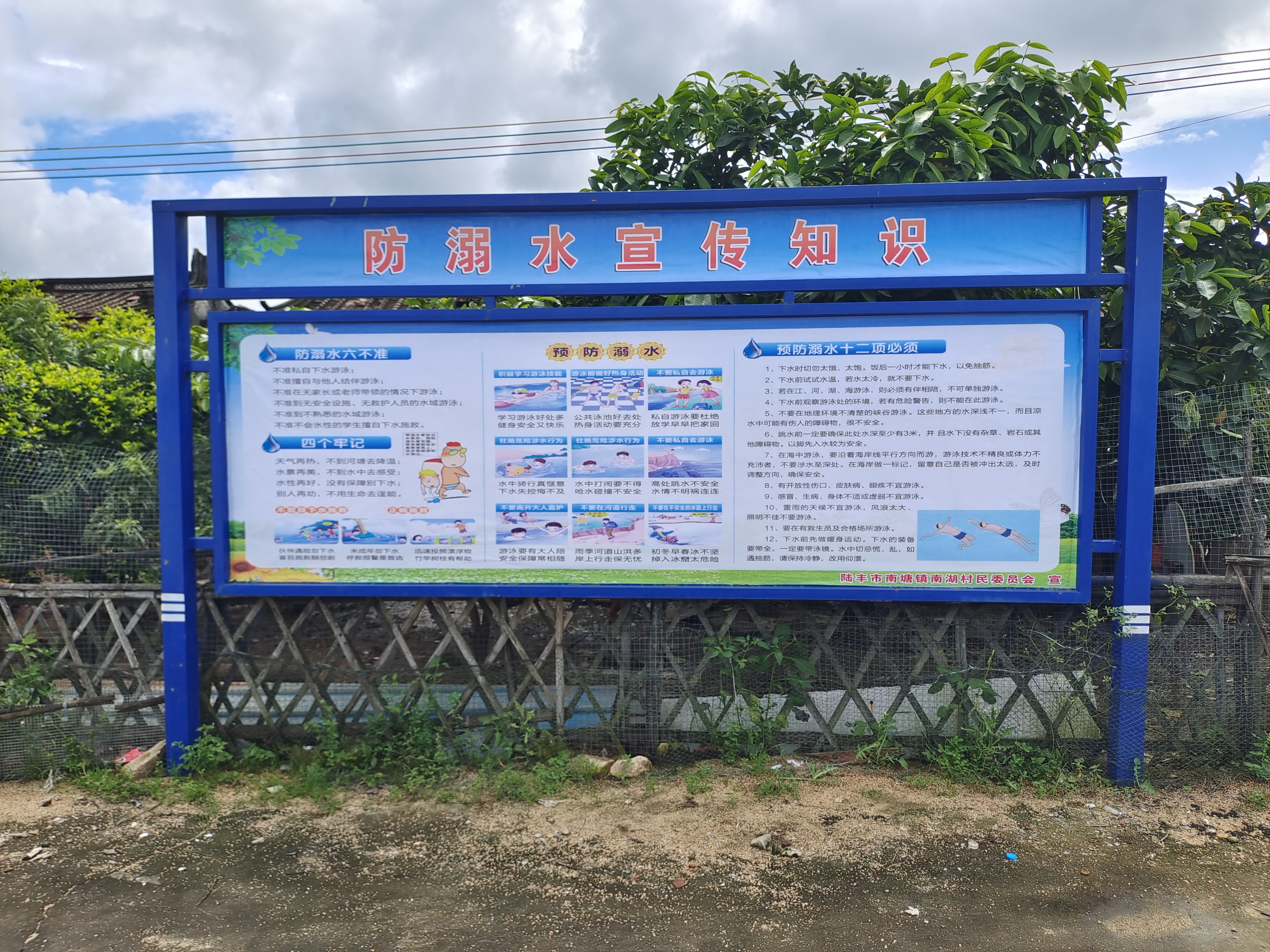与此同时,在南湖村的主要路段显眼位置,还悬挂起了制作精美的防溺水宣传知识栏。知识栏上清晰地展示着防溺水“六不准”“四个牢记”“预防溺水十二项必须”等相关知识。这些知识以醒目的字体和生动的图片呈现,时刻警示着过往的学生和家长,让他们在日常的出行中也能不断接收到防溺水的重要信息。