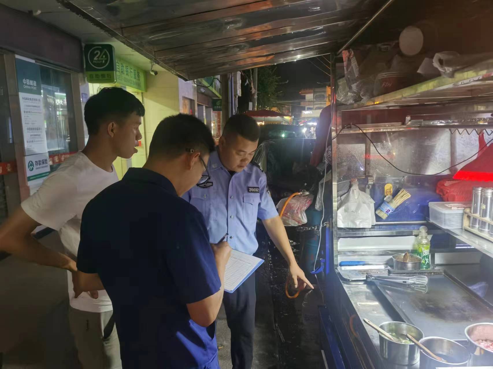 行动中,一是重点整治地摊集中区域的燃气安全、电气线路进行了检查,发现部分摊位燃气阀、燃气管老化,电线乱拉乱挂,存有安全隐患,已要求经营者现场立即整改;二是重点整治检查食品摊贩健康证明持有情况,督促没有办理健康证明的经营者其尽快办理,同时,对食品加工和储存条件进行了查看,发现部分食品原材料随意放置,没有任何防护措施,已要求其改进;三是重点整治地摊设置位置占用消防通道问题,对部分存在占道经营,已现场进行清理和规范,同时提醒经营者注意打扫卫生,不得乱丢垃圾。