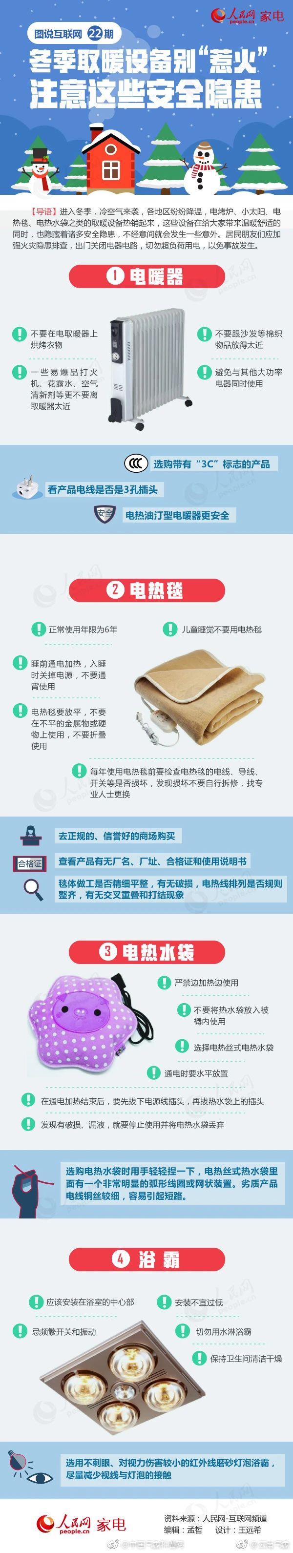 近日,冷空气频繁,各地区纷纷降温,电烤炉、小太阳、电热毯、电热水袋之类的取暖设备热销起来,这些设备在给大家带来温暖舒适的同时,也隐藏着诸多安全隐患,大家出门时要关闭电器电路,切勿超负荷用电,以免事故发生。