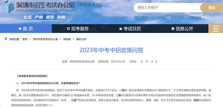 2023年深圳市中考政策提出严控加分优待项目,按照上级文件要求,仅对符合条件的军人、警察、消防、烈士子女给予相应加分投档,取消了散居少数民族考生中考加分。