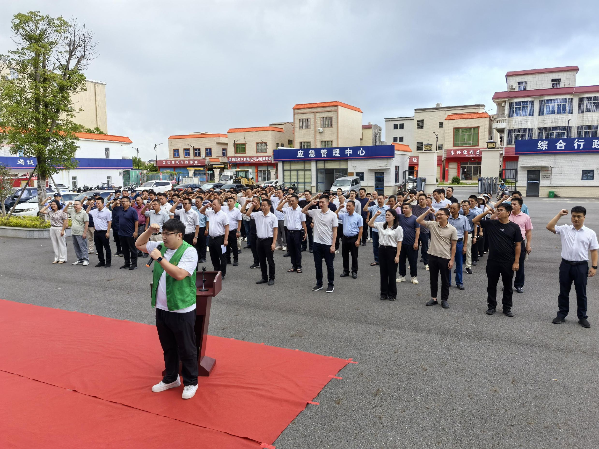 镇全体班子成员、干部职工、村(社区)干部、派出所民辅警、禁毒志愿者、网格联防员等 200 余人参加本次活动。活动由卢建燃镇长主持,在庄严的氛围中拉开序幕。在镇禁毒志愿者代表陈伟锋的带领下,参加活动的全体人员一起庄严地进行了禁毒宣誓。全体人员发出响亮宣誓,表达了大家抵制毒品、参与禁毒的坚定决心。