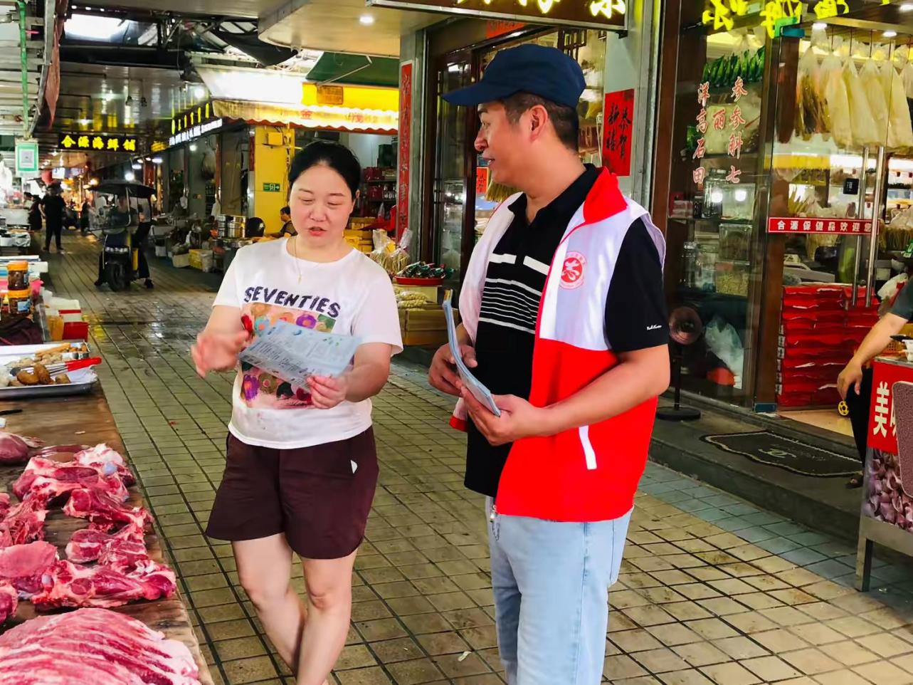 为确保重点区域防控无死角,志愿者走进市场,向摊主与顾客普及防控知识。在市场内,志愿者与摊主亲切交流,了解日常经营情况,并发放宣传资料。市场内人来人往,摊位上摆满新鲜蔬菜与肉类,志愿者与群众互动频繁,现场气氛活跃。