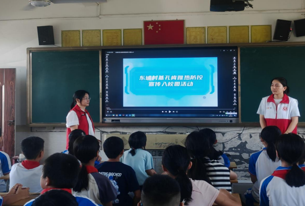 同时为提升学生对基孔肯雅热的认知水平与自我防护能力,提升学生对基孔肯雅热的认知与防控能力,通过学生带动家庭,家庭影响社会的联动效应,东埔村文明实践站组织开展《基孔肯雅热防控宣传》进校园活动。