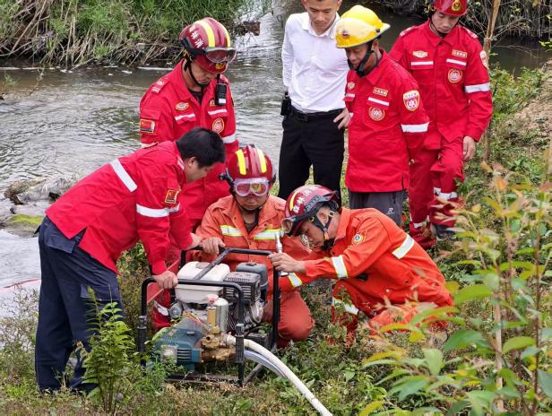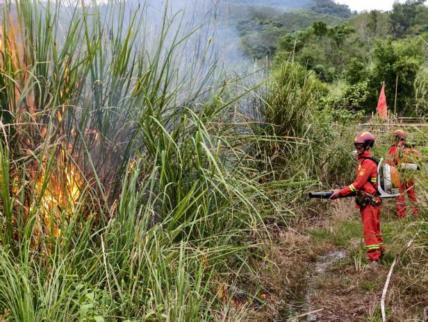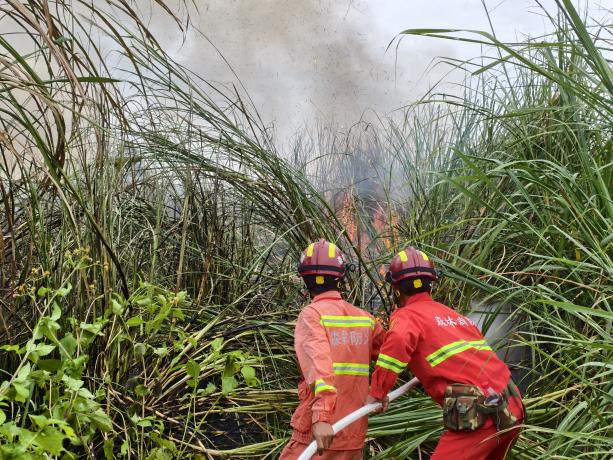救援队伍快速到达火情发生所在位置,根据现场研判,起火位置植被旺盛,火势蔓延迅速,距离配电设施约300米,火点旁有一处河流可取水。决定使用2部灭火水泵以水灭火快速控制火势,辅助使用风力灭火机缩小火势蔓延范围。经过紧张有序的扑救,明火已被彻底扑灭,明火扑灭后,现场人员对火场进行了全面细致的检查清理,防止火场复燃。