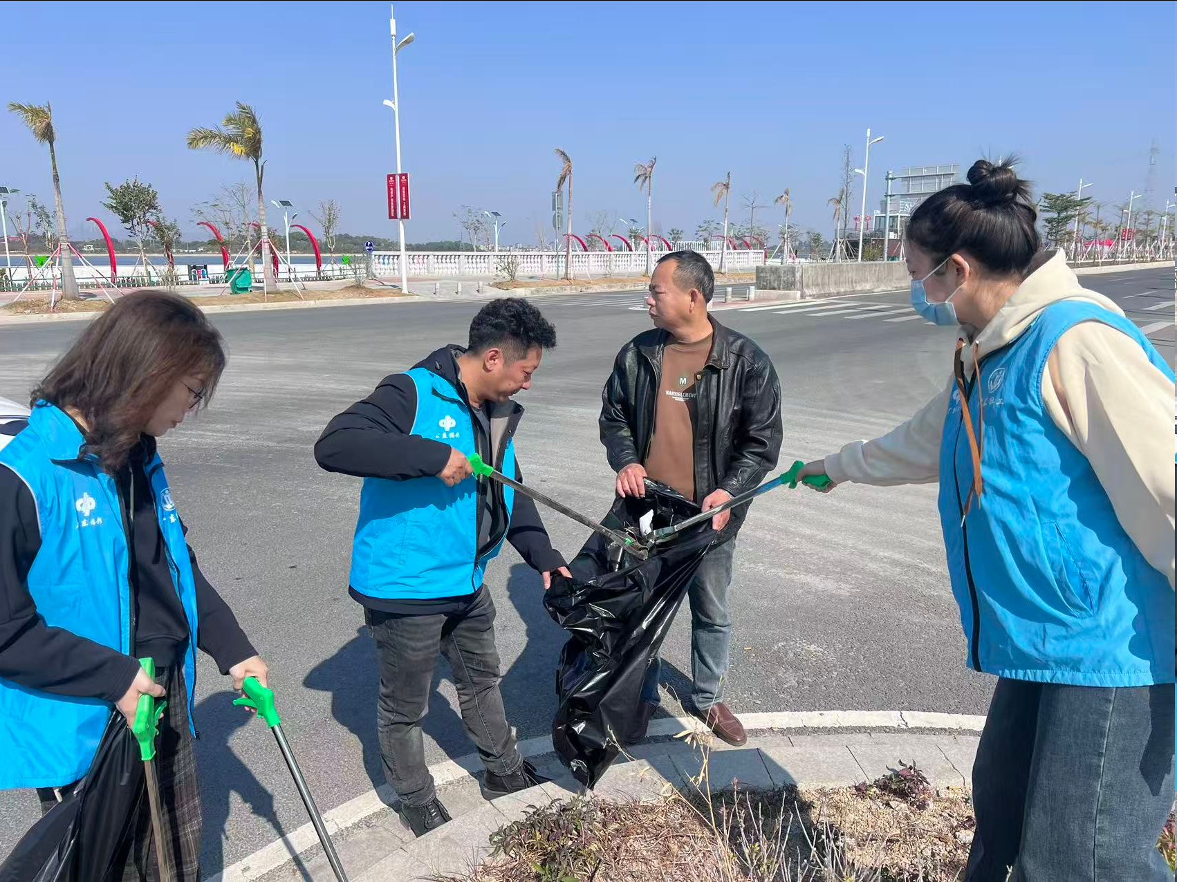 在瀛江碧道,由志愿者、社工等组成的清洁队伍认真清理碧道两边的垃圾。