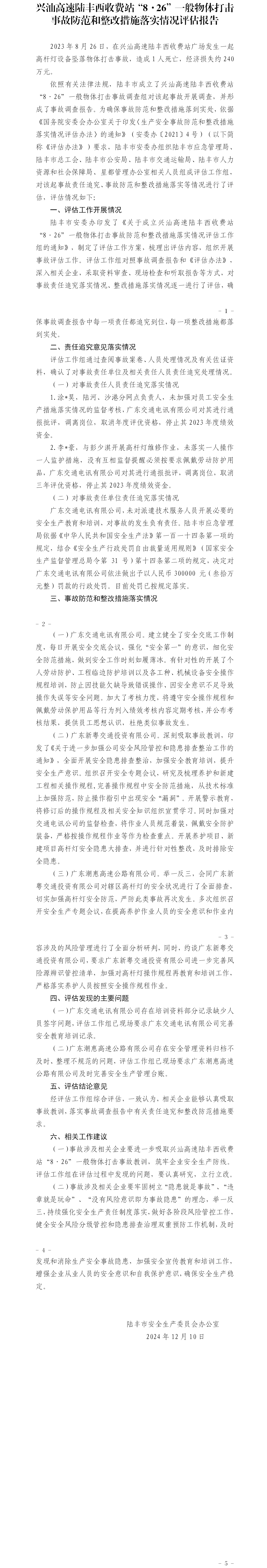 兴汕高速陆丰西收费站“8·26”一般物体打击事故防范和整改措施落实情况评估报告