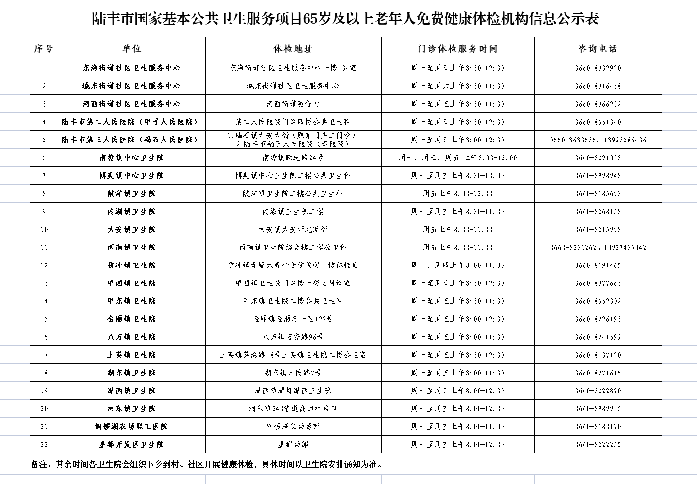 1.门诊服务见附表;2.各社区卫生服务中心、卫生院会组织下乡到村、社区开展健康体检,具体时间以卫生院通知为准;