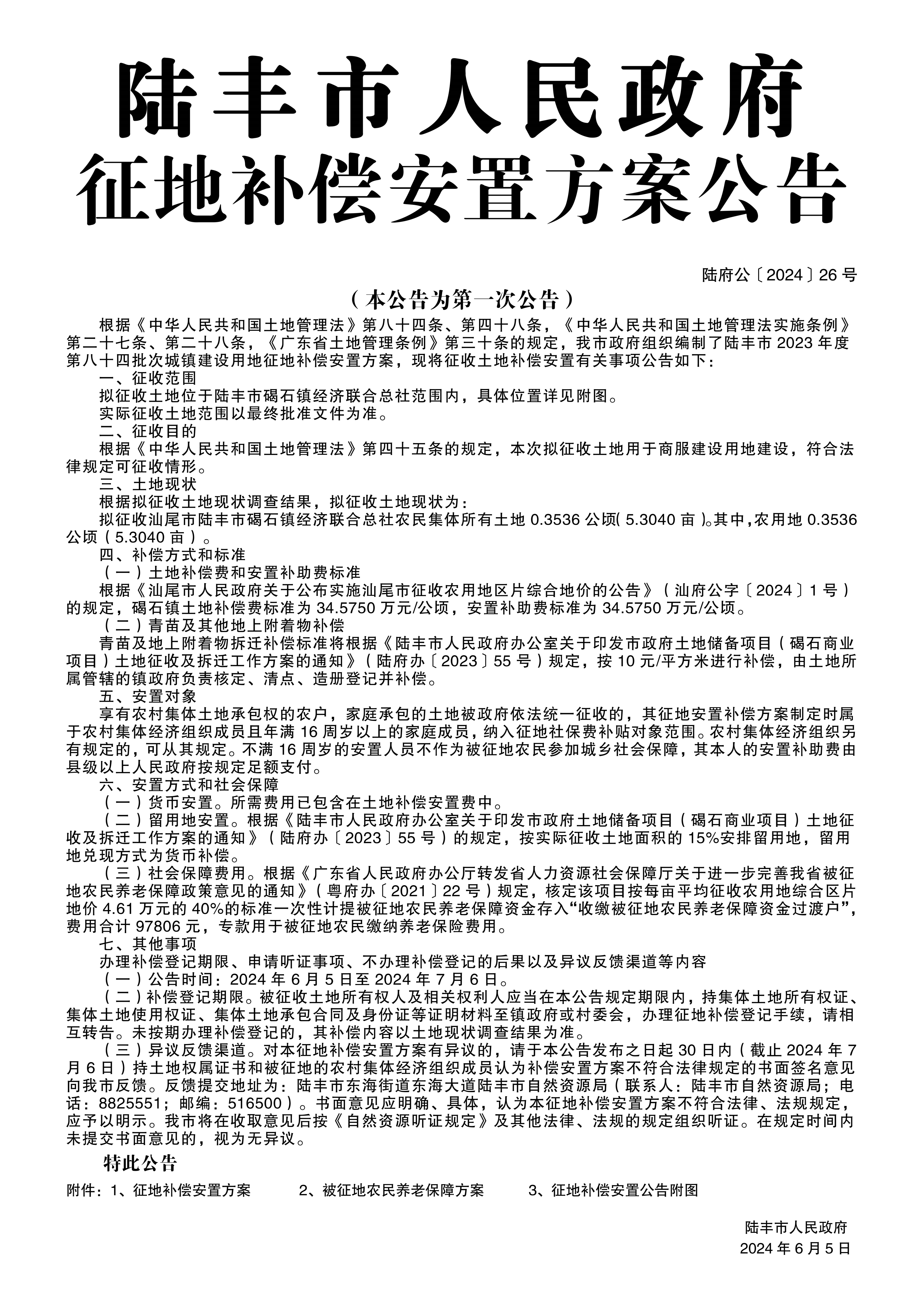 苹果直播 征地补偿安置方案公告(陆府公〔2024〕26号)
