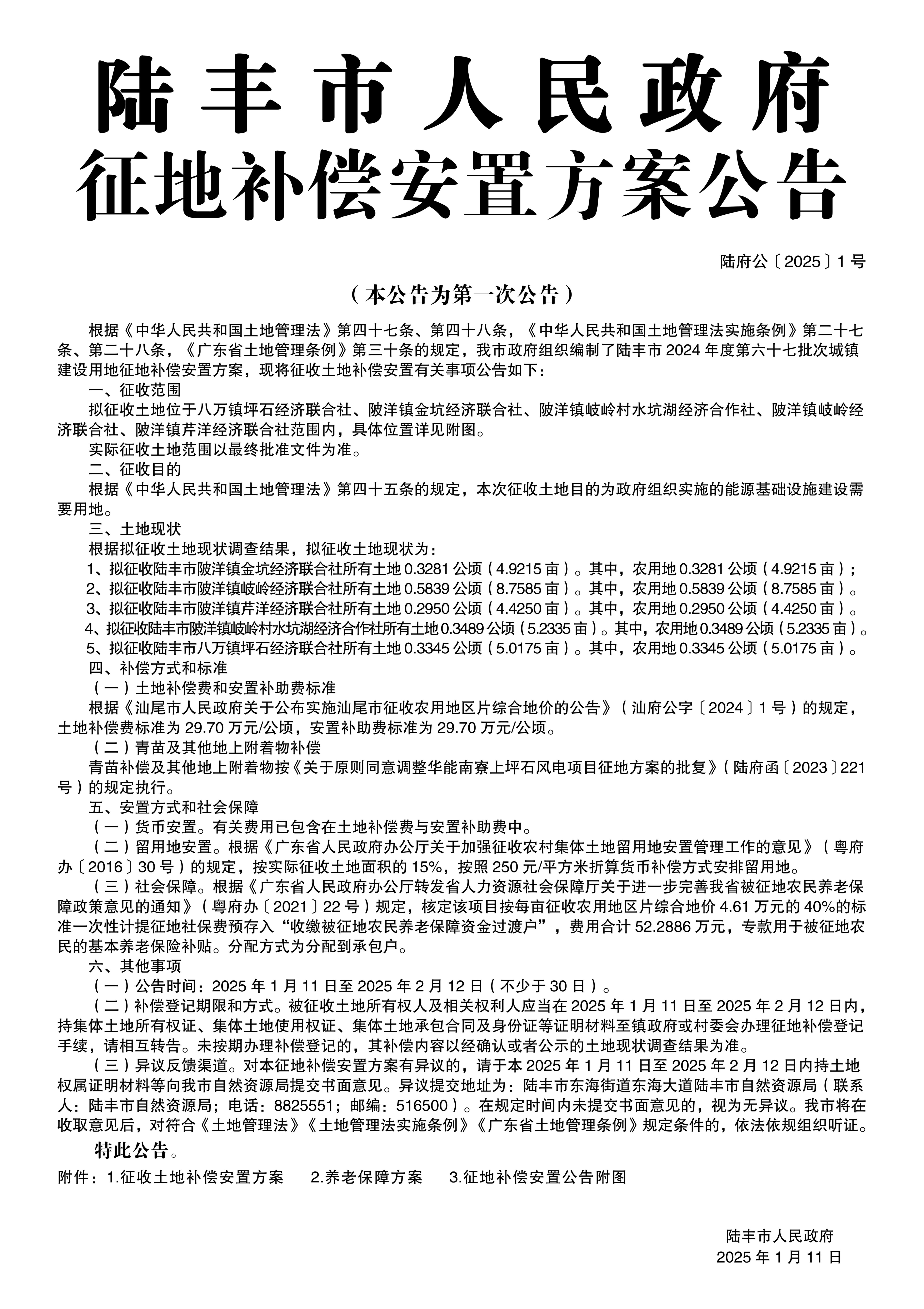 苹果直播 征收土地和补偿安置方案公告(陆府公〔2025〕1号)
