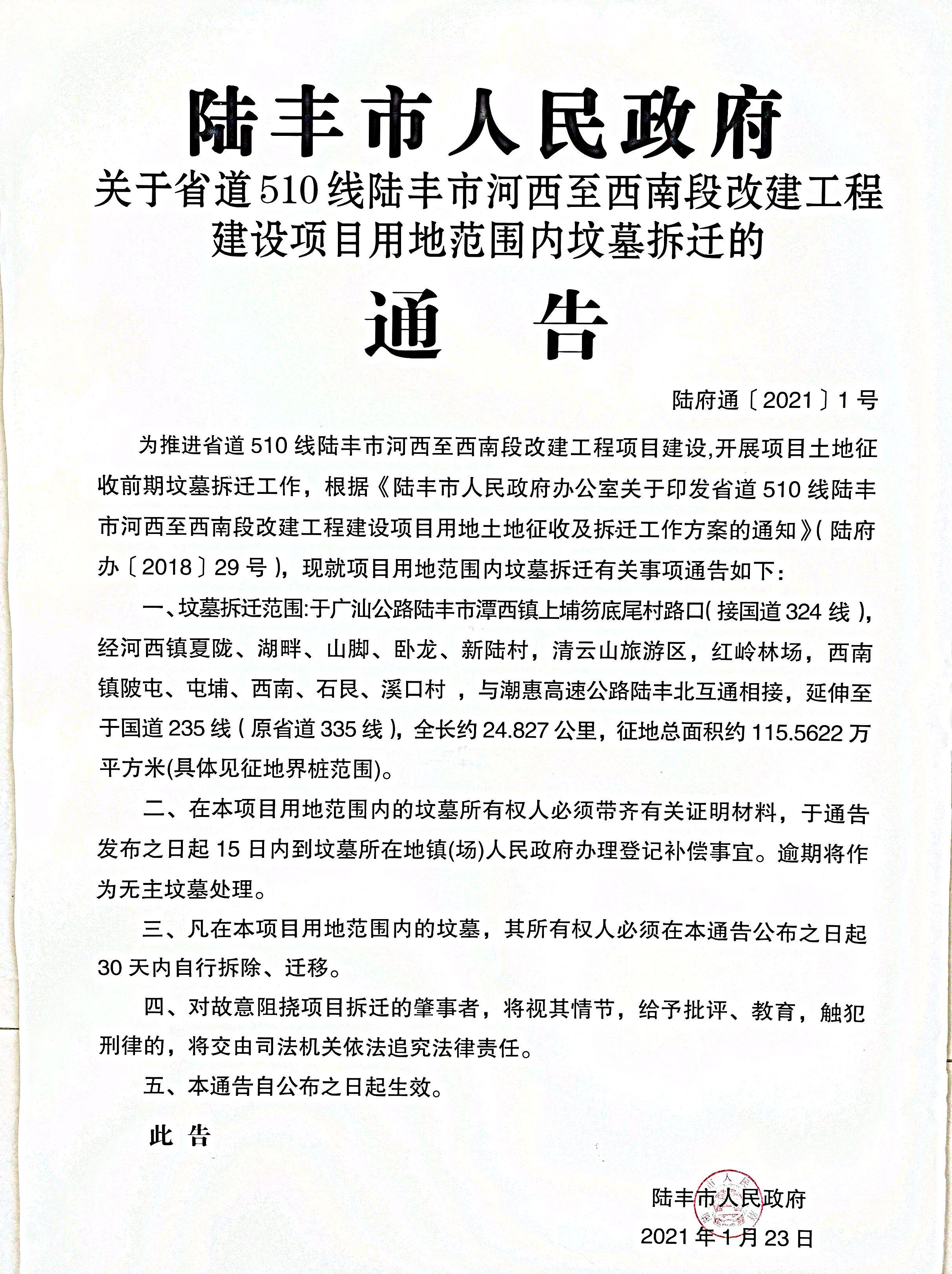 苹果直播 关于省道510线苹果直播 河西至西南段改建工程建设项目用地范围内坟墓拆迁的通告(陆府通[2021]1号)