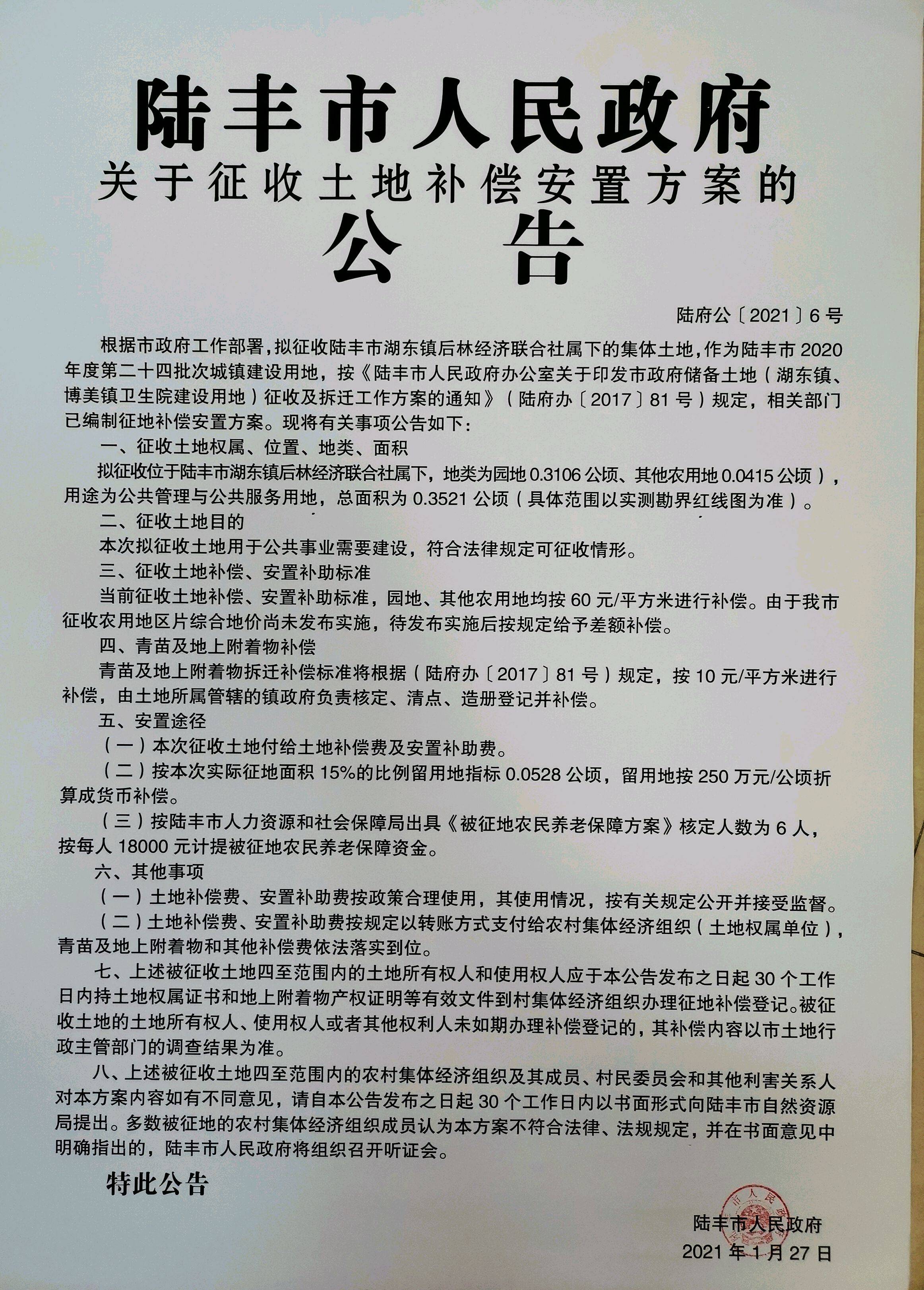 苹果直播 关于征收土地补偿安置方案的公告(陆府公[2021]6号)