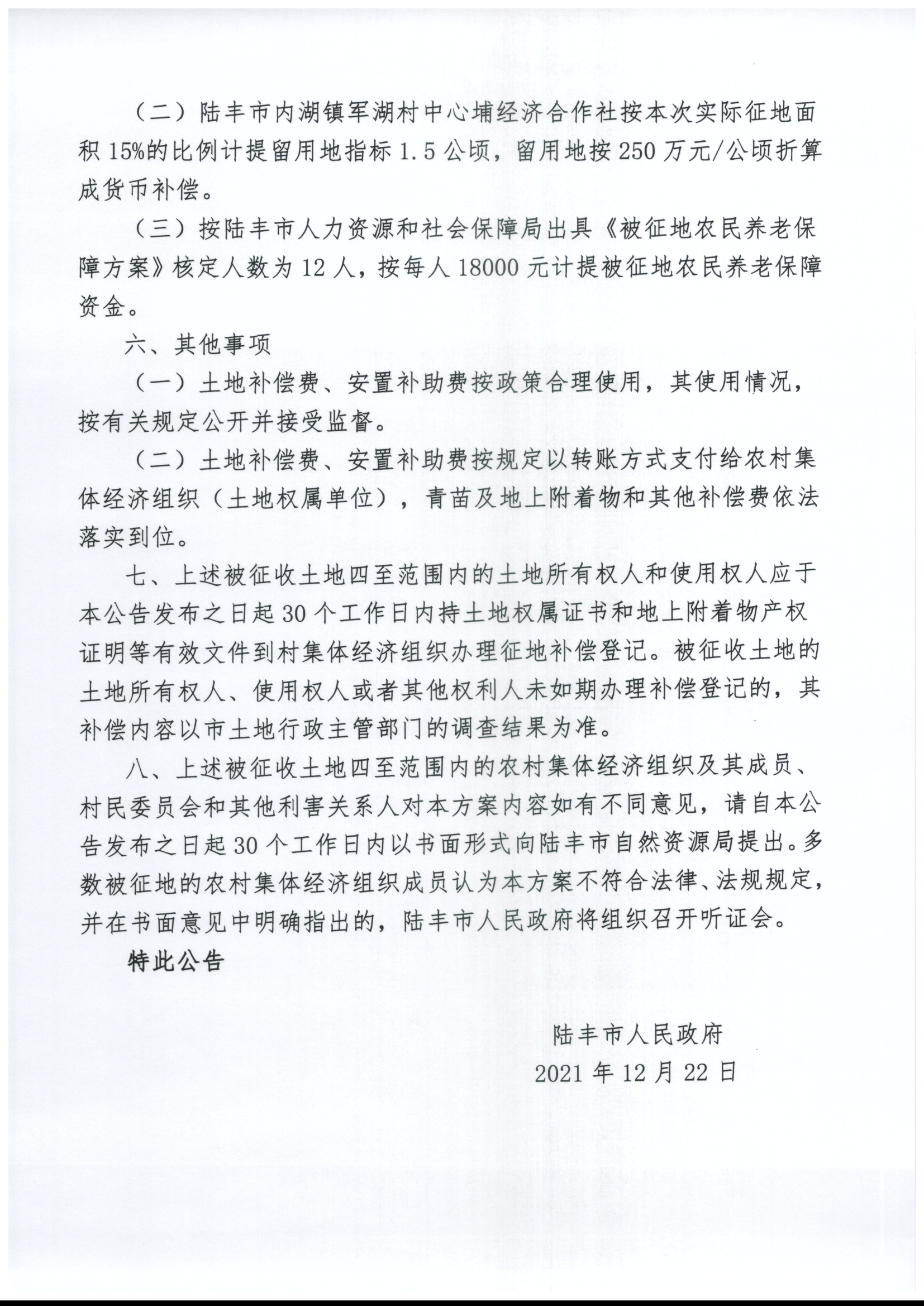 苹果直播 关于征收土地补偿安置方案的公告(陆府公〔2021〕45号)