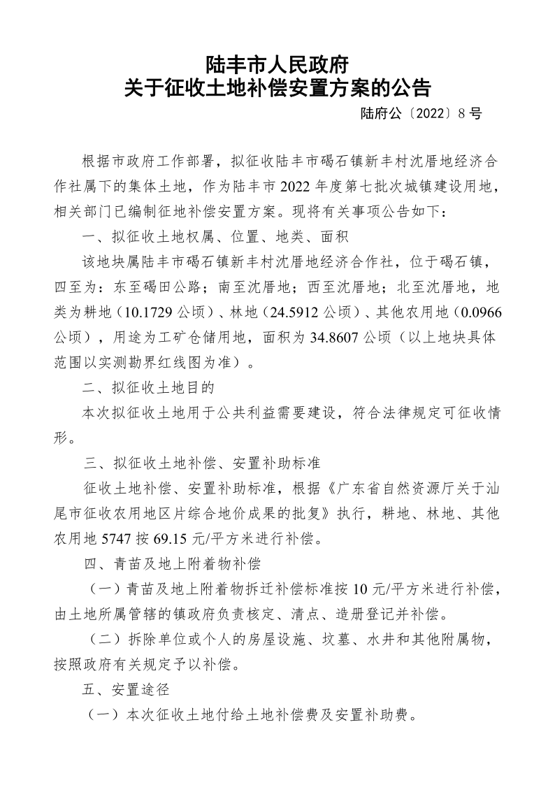 苹果直播 关于征收土地补偿安置方案的公告(陆府公〔2022〕8 号)