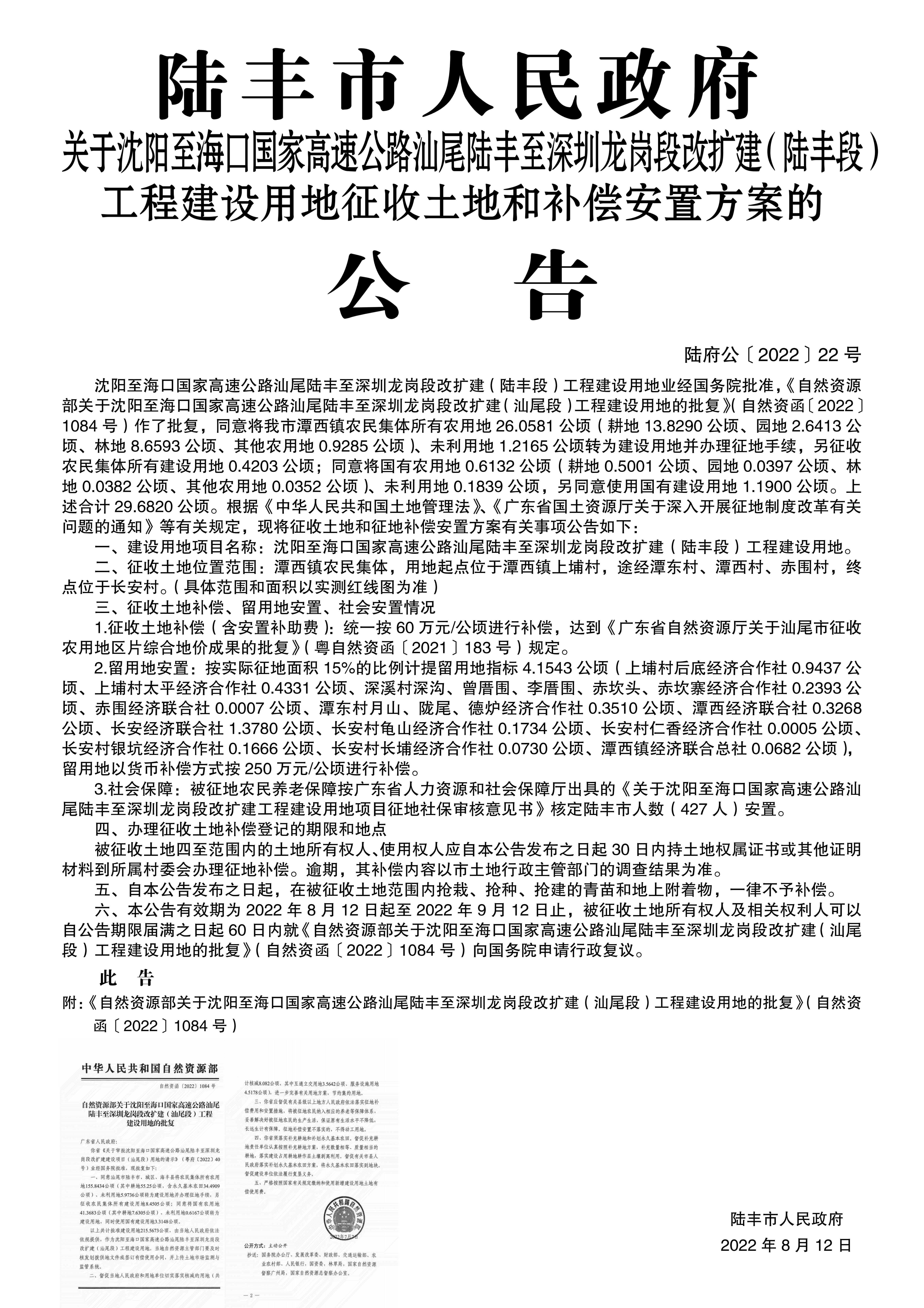 苹果直播 关于沈阳至海口国家高速公路汕尾陆丰至深圳龙岗段改扩建(陆丰段)工程建设用地征收土地和补偿安置方案的公告(陆府公〔2022〕22号)