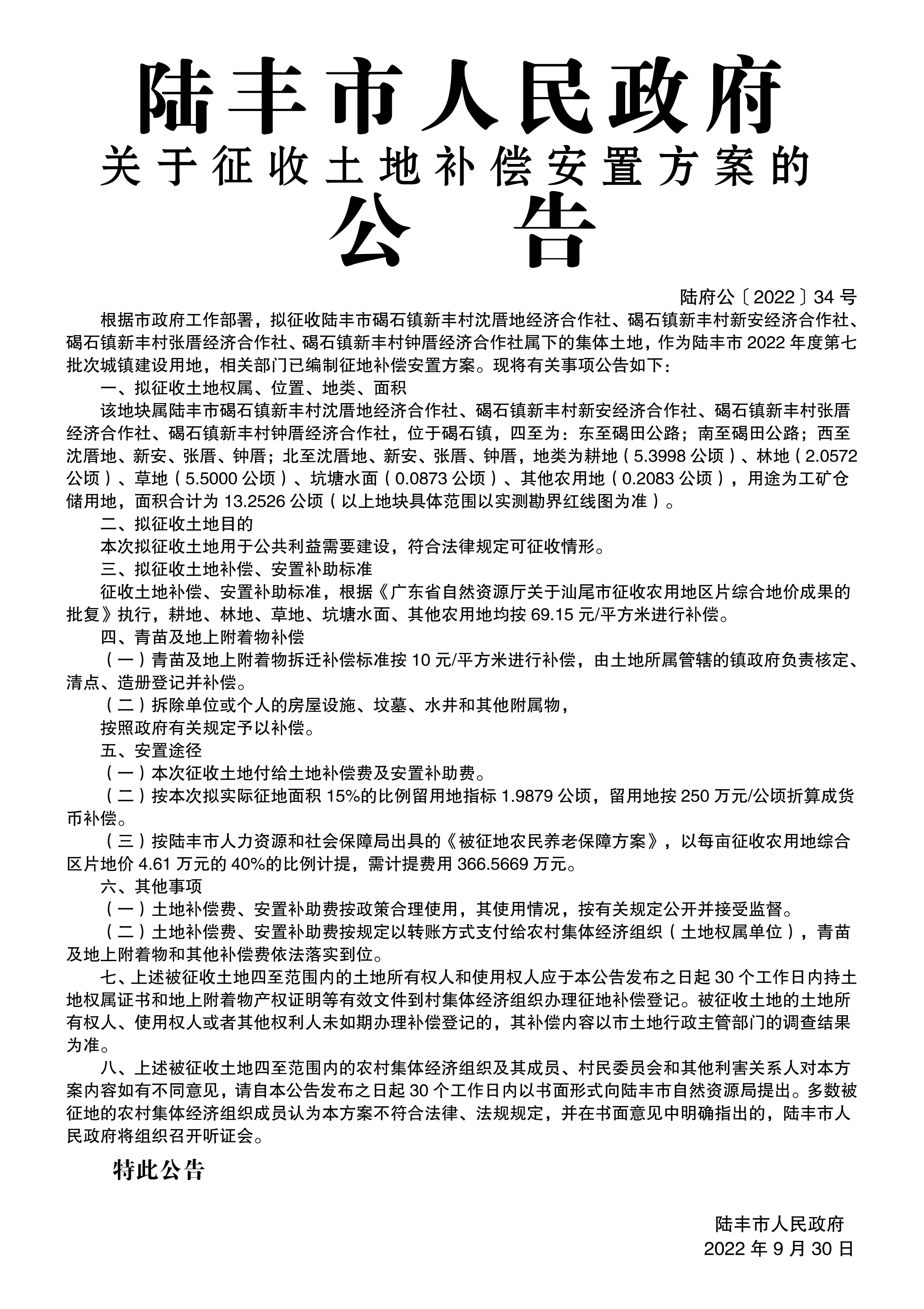 苹果直播 关于征收土地和补偿安置方案的公告(陆府公[2022]34号)