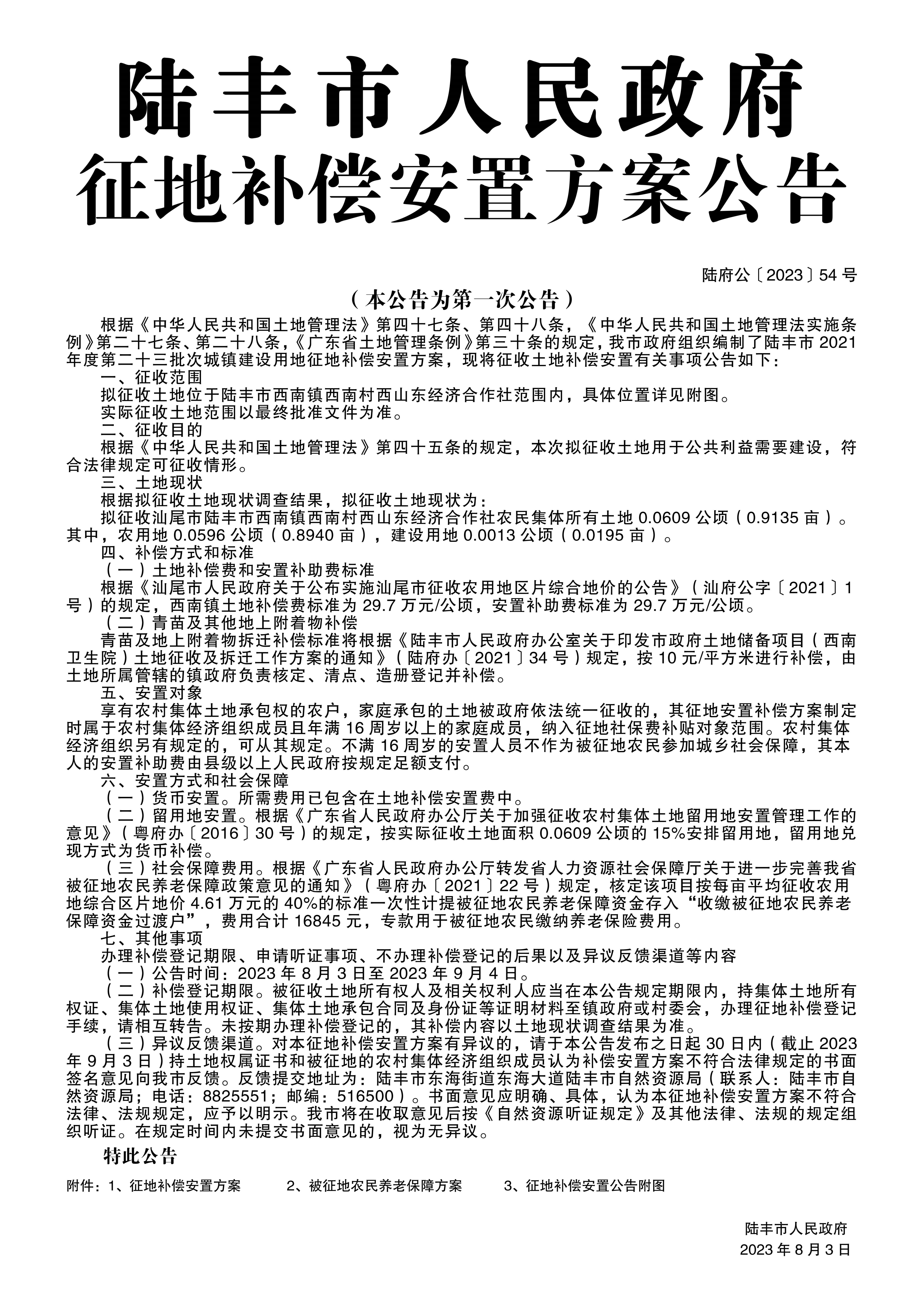 苹果直播 征地补偿安置方案的公告(陆府公〔2023〕54号)