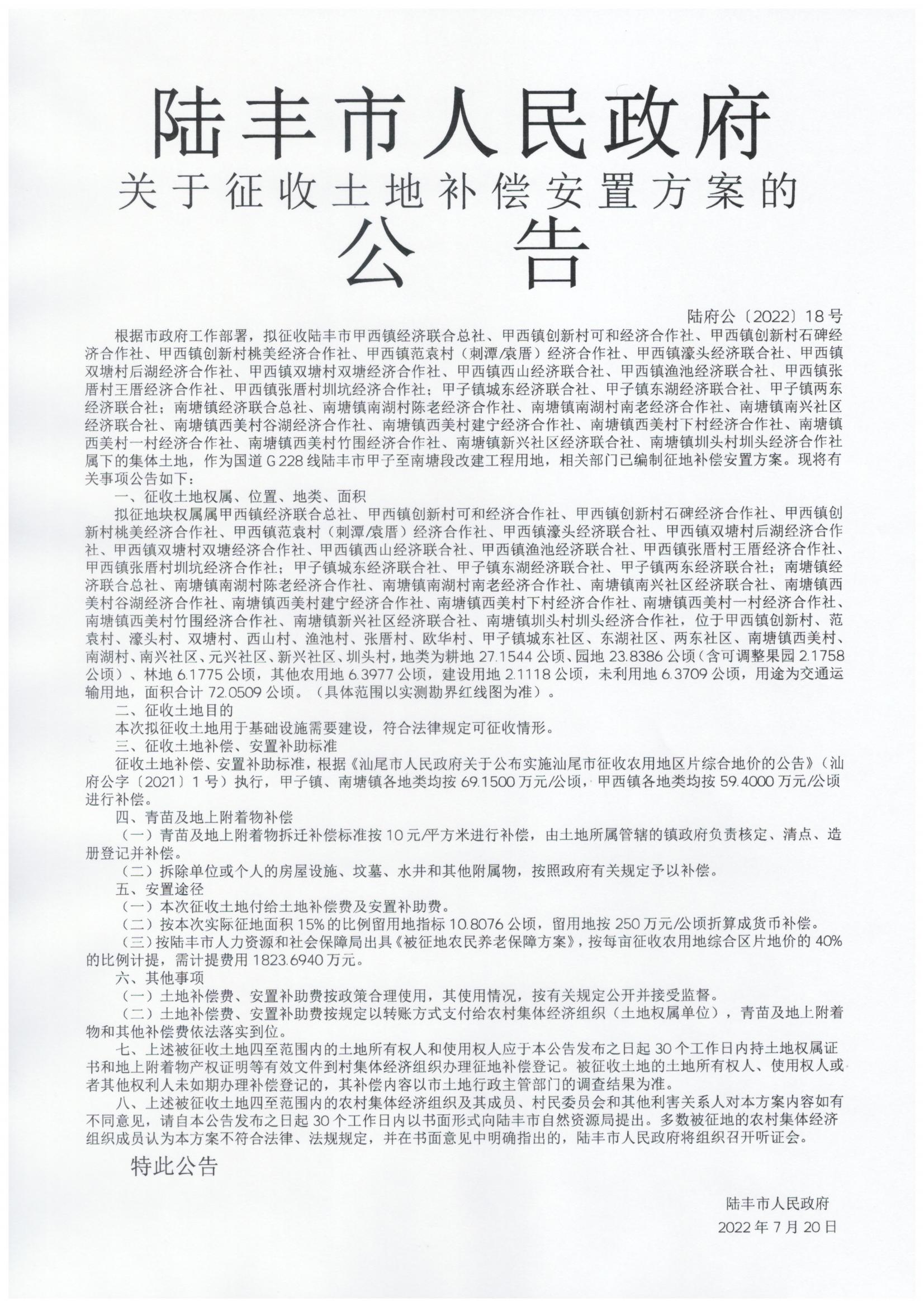 苹果直播 关于征收土地补偿安置方案公告(陆府公〔2022〕18号)