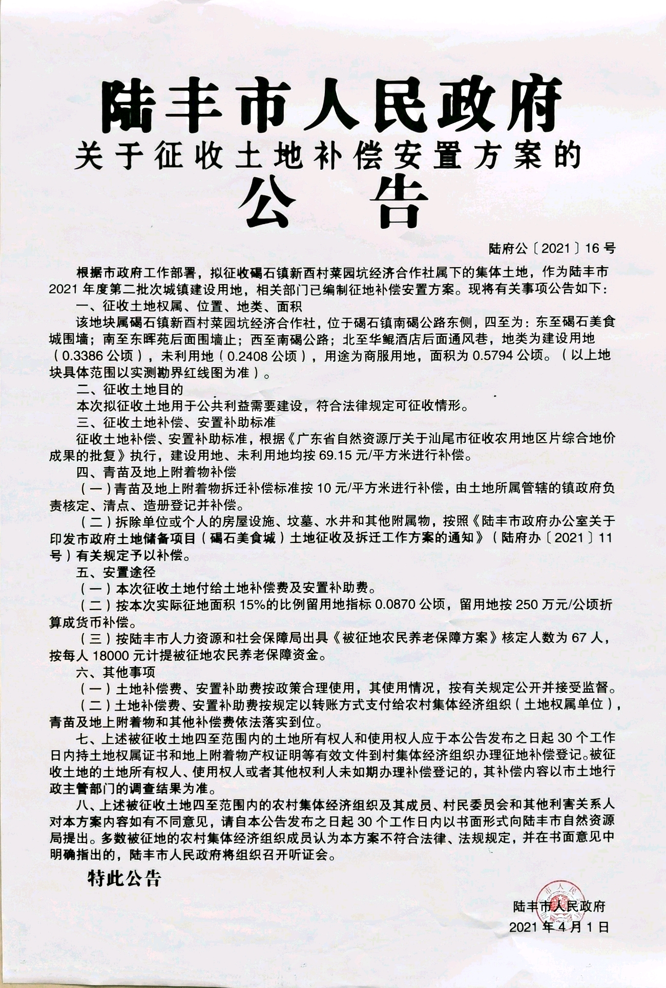 苹果直播 关于征收土地补偿安置方案的公告(陆府公[2021]16号)