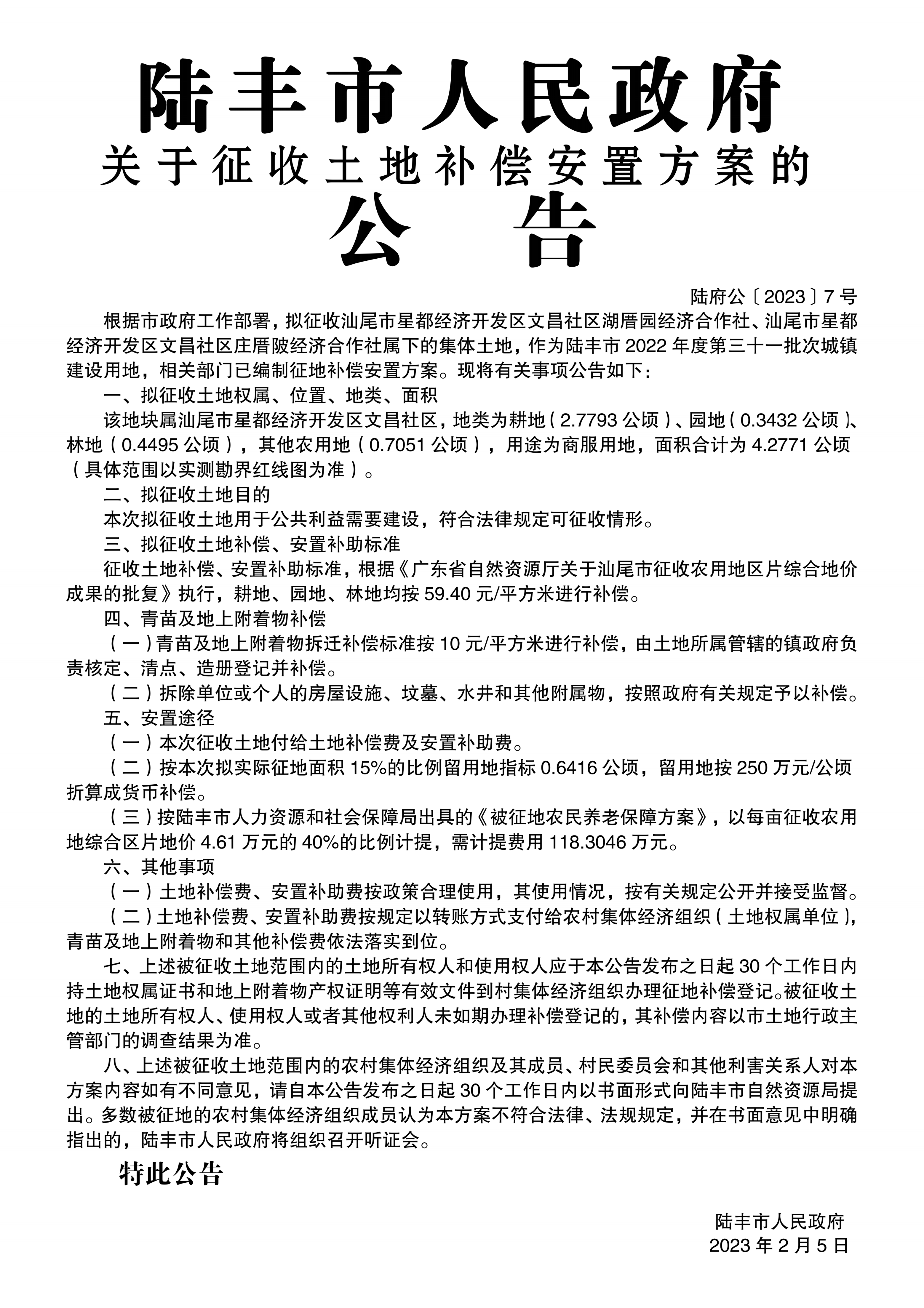 苹果直播 关于征收土地补偿安置方案的公告(陆府公〔2023〕7号)