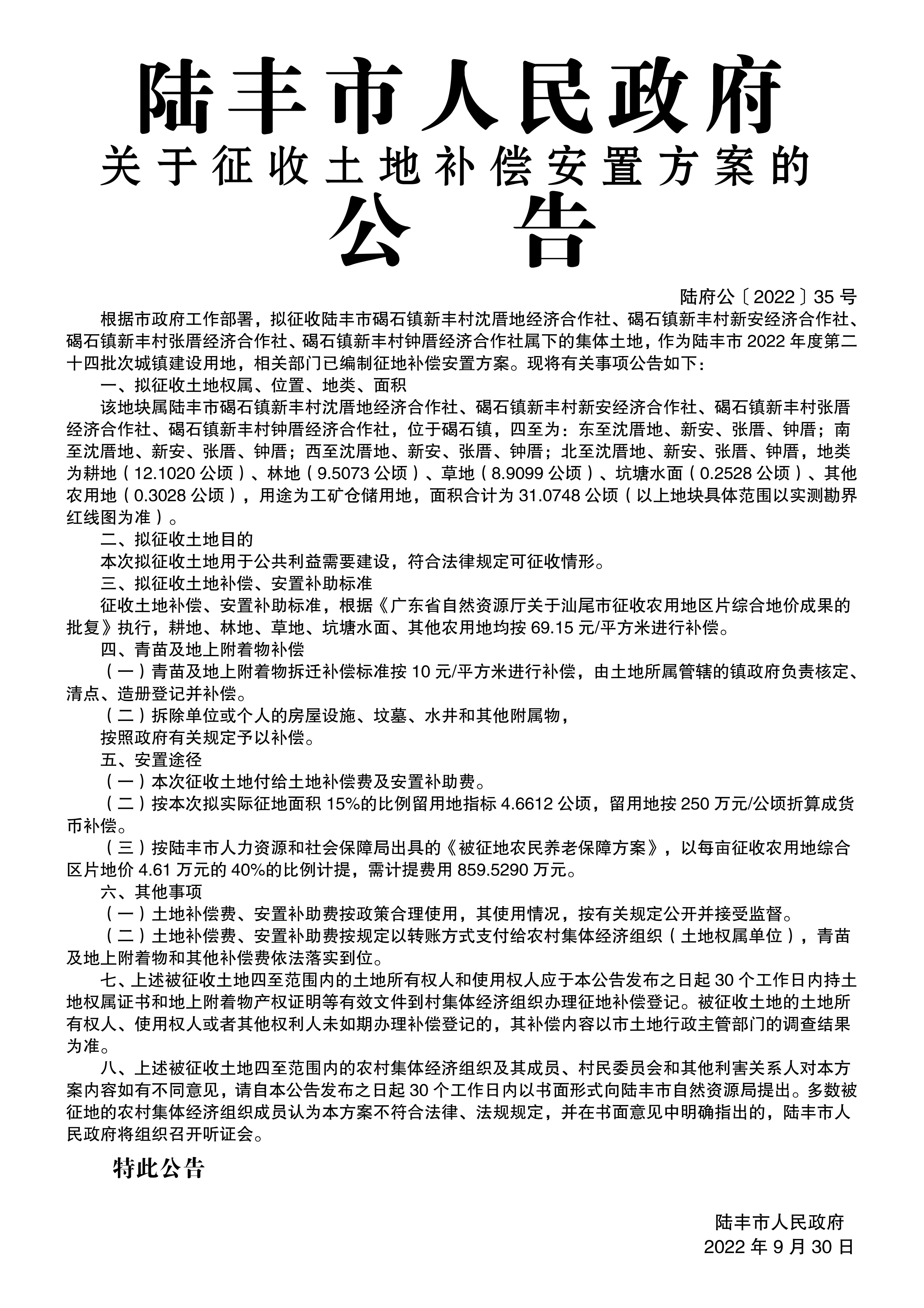 苹果直播 关于征收土地和补偿安置方案的公告(陆府公[2022]35号)