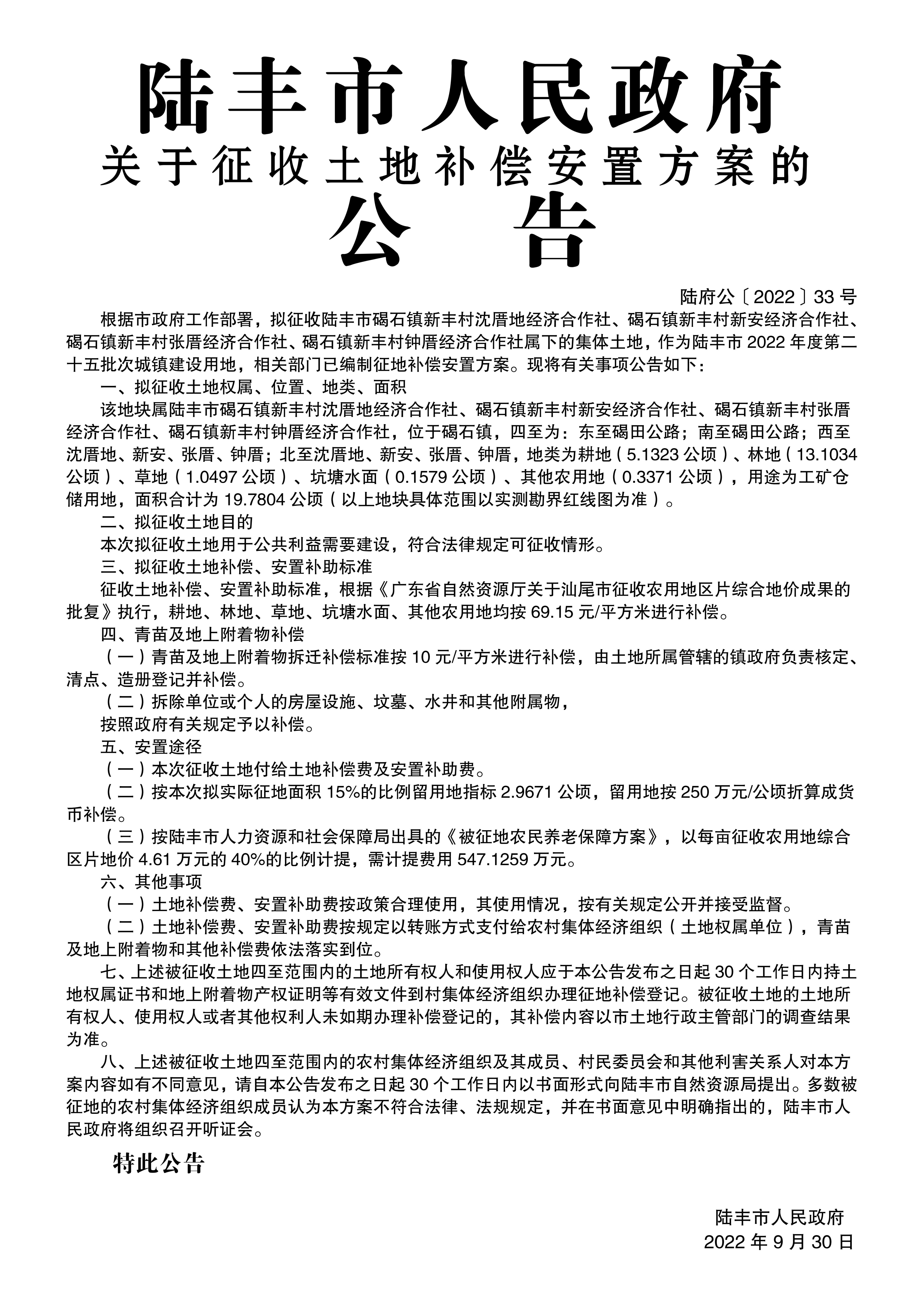 苹果直播 关于征收土地和补偿安置方案的公告(陆府公[2022]33号)
