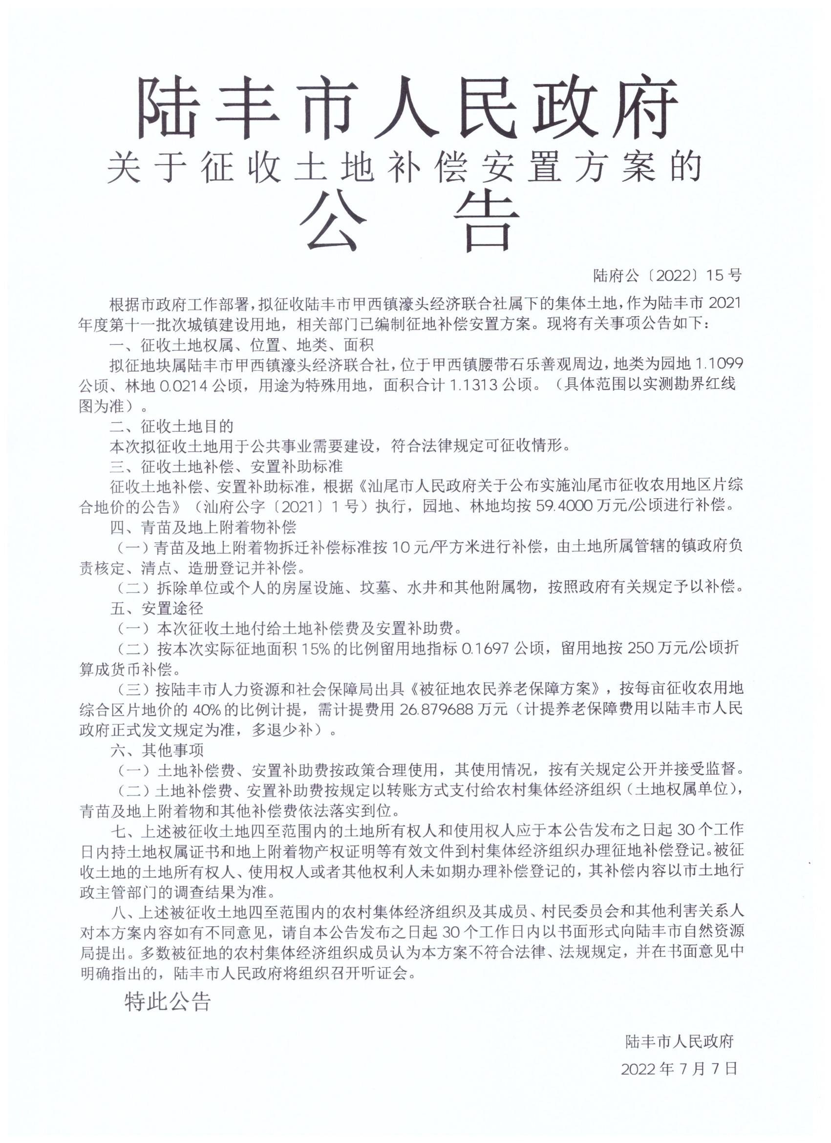 苹果直播 关于征收土地补偿安置方案的公告(陆府公[2022]15号)